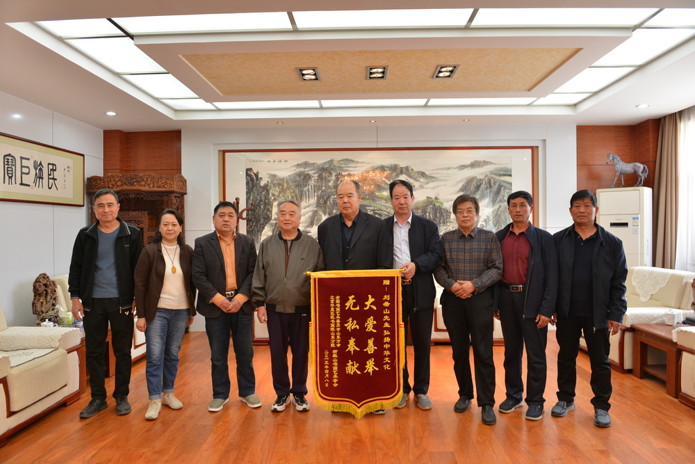 2023年4月19日上午,堂外風和日麗,室內滿座高朋。柳毅山書畫藝術學會會長張懷棟與學會主要領導孫根堂、孫國權等一行七人蒞臨盛宏公司,向劉希山董事長敬獻錦旗;中共濰坊市委原副秘書長兼市接待處主任張國華,全國太極拳冠軍、中醫一級針灸師孫愛文先生蒞臨現場祝賀。劉希山董事長高興地接待客人,王秋萍副董事長陪同接待,并與大家合影留念。