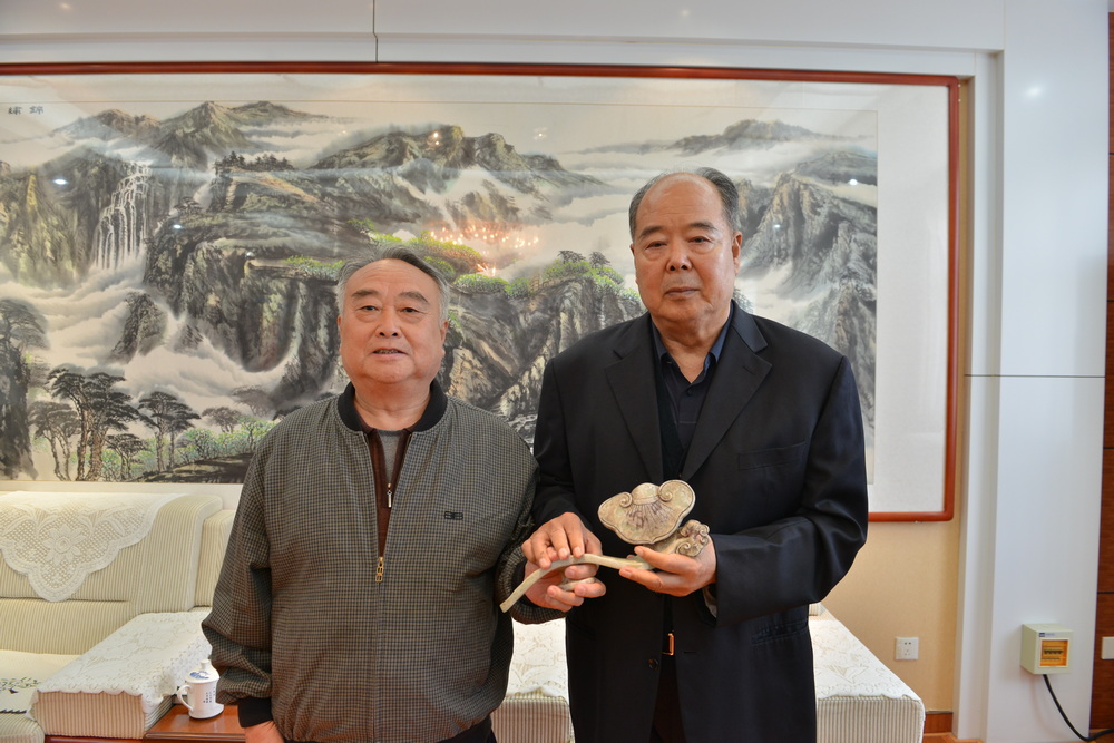 張國華先生將自己珍藏的一支靈芝玉如意贈送劉希山董事長,恭祝劉教授身體安康、吉祥如意。劉希山董事長也將自己親筆書寫的一筆榜書“一步登天藏龍福”、“一生百年壽”和“觀音送子佛”等作品贈送客人。該作品榮獲全國第九屆“中國夢想杯”書畫大賽“金獎”,劉希山教授先后獲得“國家高級書法師”、“中國書法大家”等榮譽稱號,并受聘為“全國書畫藝術委員會副主席”。其作品“一生百年壽”被雕刻于泰山山脈的徂徠山上。