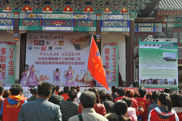 | 盛宏中醫院參與山東公益聯盟十七地市第二站公益活動 2016年3月20日,由中央電視臺新聞中心和中國人口福利基金會發起、山東電視臺影視頻道和山東公益聯盟主辦、濰坊市文明辦等單位承辦的“我的父親母親,讓愛送您回家——山東公益聯盟十七地市第二站公益活動”在濰坊十笏園文化廣場舉行。盛宏中醫院的專家和醫務人員應邀到現場為中老年人義診服務,并向大家宣傳介紹采用中藥提速透化療法治療腰椎間盤突出和股骨頭壞死等頑疾的知識,受到鳶都老百姓的歡迎。 |