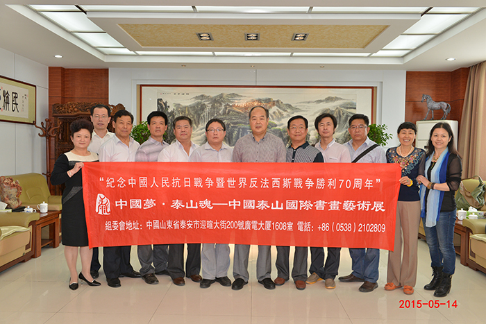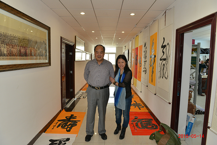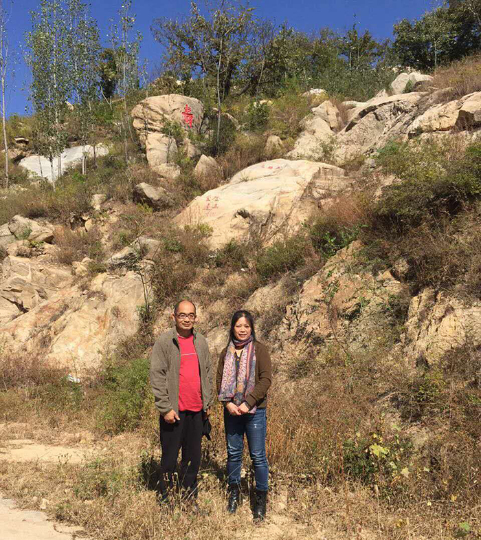 泰安市錦江文化創意有限公司董事長朱瑞媛女士(右一)在壽石下合影。 2015年5月14日,以“紀念中國人民抗日戰爭暨世界反法西斯戰爭勝利70周年”“中國夢﹒泰山魂”為主題,泰安市錦江文化創意有限公司董事長朱瑞媛女士、中國泰山國際書畫藝術展組委會主任高甲勝、濰坊書畫界馬平、于廣俊等一行十余人蒞臨盛宏公司拜訪劉希山董事長。他們對劉希山董事長發明中藥提速透化療法治愈千千萬萬股骨頭壞死、腰椎間盤突出等頑疾患者充滿敬意,并請劉教授當場寫下“一生百年青年壽”以刻石,與中藥提速透化療法共同垂芳后代。