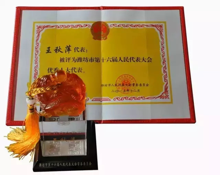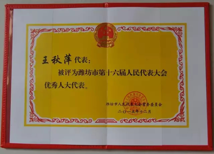 2015年12月,濰坊市人大常委會授予盛宏公司總經理王秋萍“濰坊市第十六屆人民代表大會優秀人大代表”稱號。 王秋萍總經理是巾幗創業的佼佼者,她帶領盛宏人為全國百萬股骨頭壞死、腰椎間盤突出等頑疾患者解除了病痛,先后榮獲“全國維護婦女兒童權益先進個人”、“山東省三八紅旗手十大標兵”、“影響山東十大經濟女性”、“省巾幗建功標兵”、“建國六十周年影響濰坊十大優秀企業家”、“情系北川·愛心大使”等多項榮譽稱號。管理工作之余,她積極參政議政,先后當選市政協委員、市人大代表等職。其政協提案《關于把家政服務業納入社會化服務體系的建議》被評選為優秀提案。 |