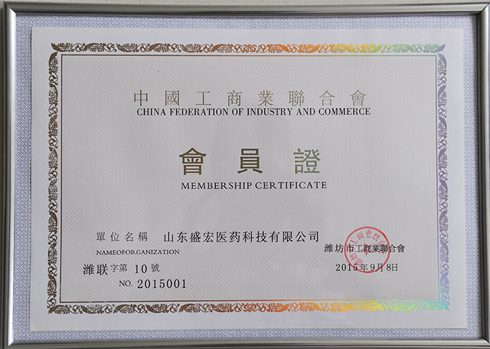 2015 年9月8日 ,山東盛宏醫藥科技有限公司被中國工商業聯合會接納為會員單位,并由濰坊市工商聯于 9月 9日 頒發了會員證書。