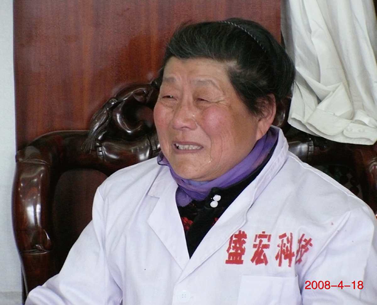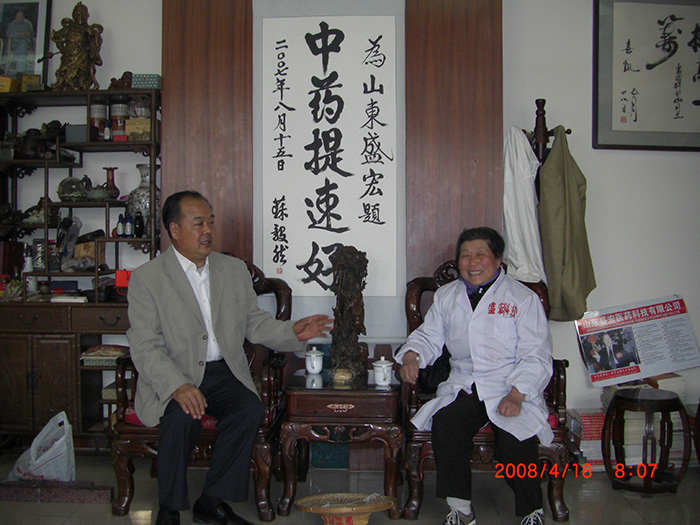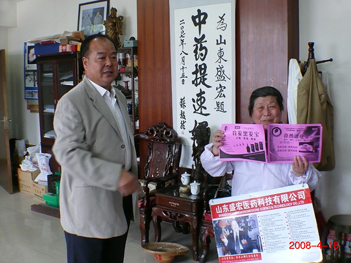 盛宏公司來了一位特殊的客人,為見劉希山董事長一等就是三天,見到后激動地緊緊握著董事長的手,熱淚盈眶,泣不成聲。她叫趙秀蕓,79歲,家住棗莊市薛城區,因盛宏產品治好了她的腰椎間盤突出癥,不辭勞苦來到盛宏,只為向劉教授當面致謝。她自制了一塊60厘米寬、40厘米高的牌子,穿一件印有“中藥提速好”的白衣長衫,戴一頂寫有“盛宏科技”的禮帽,并一路騎著自行車,義務發放了 500份宣傳盛宏產品的單頁。