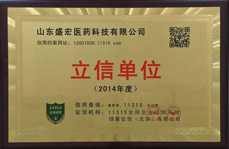 2015年8月14日,山東盛宏醫藥科技有限公司被評為“2014年度立信單位”,并由11315全國企業征信系統頒發了獎牌。這是盛宏公司在治療股骨頭壞死、腰椎間盤突出等頑疾方面憑真實療效獲得的二百多項大獎之一。