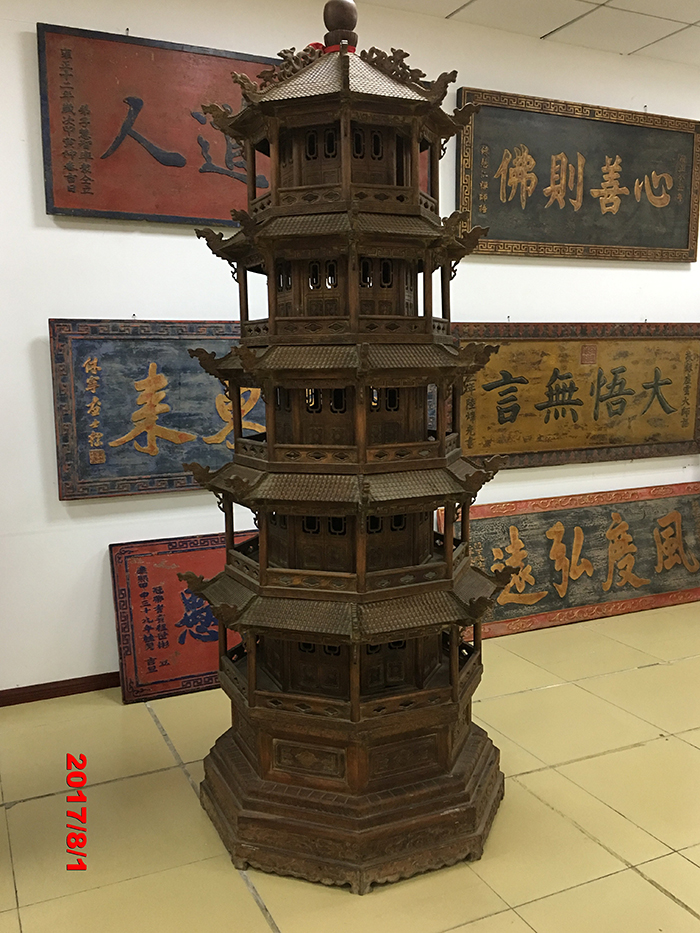 塔,是古今中外極莊嚴和極受尊重之物。塔者,又叫作“塔婆”,或叫作“支提”,意思是滅惡生善處。盛宏老子館收藏的這兩座寶塔均為五層露盤,大小形質完全相同,塔高2.4 米,純紅木古代特殊工藝精雕細作而成,具有較高的收藏與藝術價值。