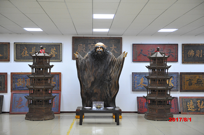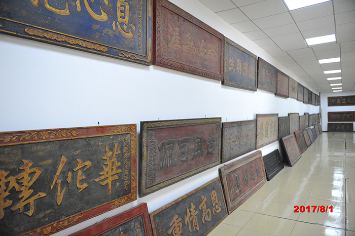 盛宏老子古匾館,位于舊館東側,光映像頂,地列清磚,寶塔矗立于兩側,墻壁鑲嵌著300塊古匾。匾匾是古代大家之墨寶,書法之典范,文筆生輝,蘊涵妙義。故來者無不嘆為觀止,紛紛又稱此館為“古匾館”。館中千年老子像與明清古代匾額相互輝映,融為一體。“紫氣東來”、“無欲則剛”、“大悟無言”、“道濟群生”等匾額,正是對老子智慧和道德的褒譽。