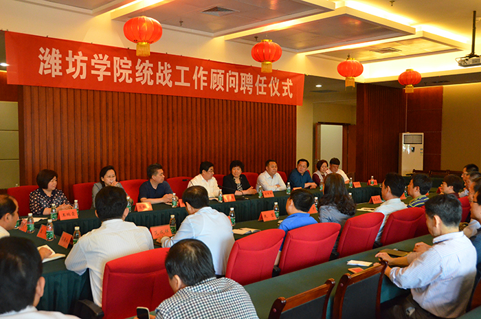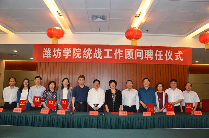 2017年5月12日,濰坊學院舉行統戰工作顧問聘任儀式,全國三八紅旗手、濰坊市人大代表、盛宏公司總經理王秋萍等十名行業精英受聘為“濰坊學院統戰工作顧問”。濰坊學院黨委書記孫文亮為王秋萍等頒發聘書,并在聘任會上致辭。濰坊市政協副主席劉秀平、濰坊市委統戰部副部長于來剛等出席會議。