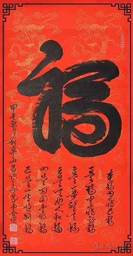 劉希山教授親筆書寫“一步登天藏龍福”。 1、一步登天福:左邊之人如火箭噴射出粒狀物,一步登天。 2、福中藏龍福:福中藏龍,龍中藏福,龍福融為一體,故有靈氣。3、天時地利人和三才福:人與右邊的天時、地利連為一體,三才和美,和氣生財。4、田地豐收福:田中糧食滿囤,是“最圓滿的福”。5、一筆不斷一生順利福:十三畫的“福”字一筆寫成,象征一生順利,福氣不斷。因為內含以上“五福”,故得到該福即是“五福臨門”,榮獲國家專利(專利號:ZL201330160990.1),被人們譽為“國家專利第一福”。 |