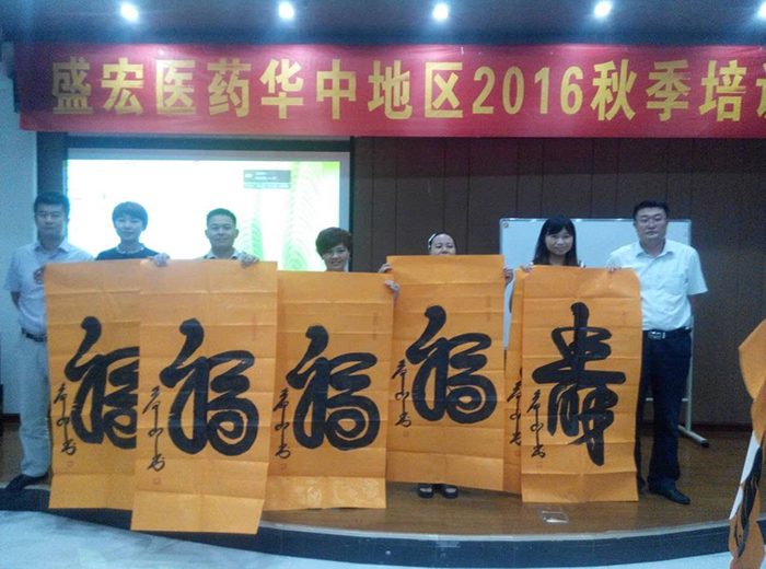 商界精英們得到劉希山教授親筆書寫的一筆“一生百年青年壽”、“一步登天藏龍福”榜書如獲至寶。
