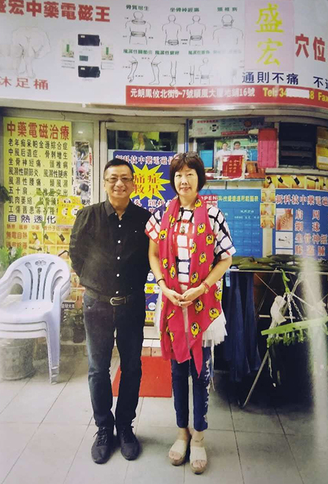 圖為香港電磁治療儀專賣店一角;及莫秀梅與香港立法局議員陳浩鼎等合影。
