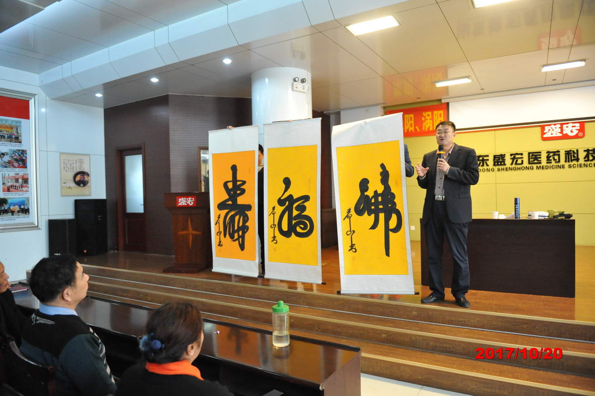 盛宏公司執行總經理劉桂波熱情接待遠來客商,市場部經理劉曉偉、專家王春生等給大家作了產品與市場講解。劉希山董事長親筆書寫“觀音送子佛”、“一生百年青年壽”、“一步登天藏龍福”三個充滿神韻的大字贈送客人。各位精英還參觀了新落成的科研樓、生產廠區、盛宏四館,大家親眼目睹了盛宏總部的實力和活力,對市場前景充滿信心。
