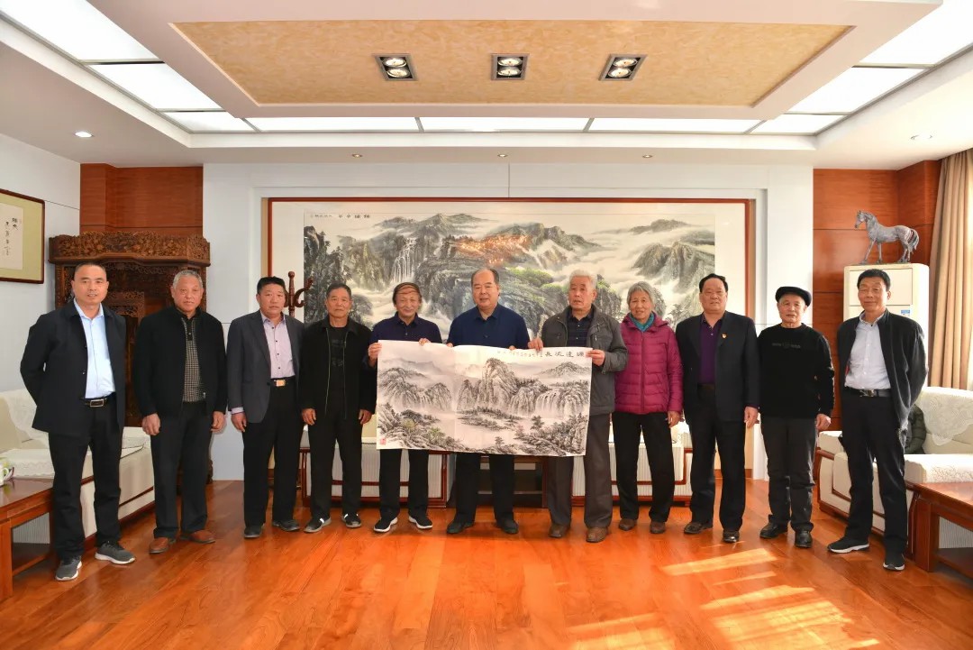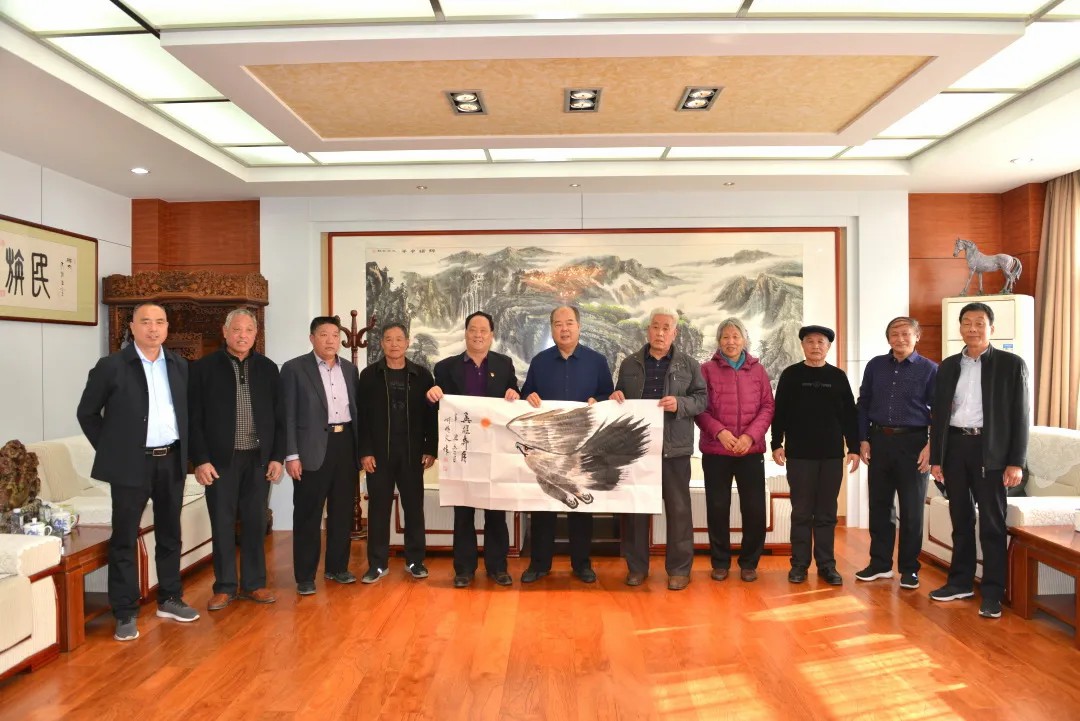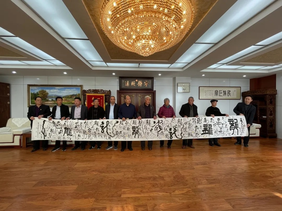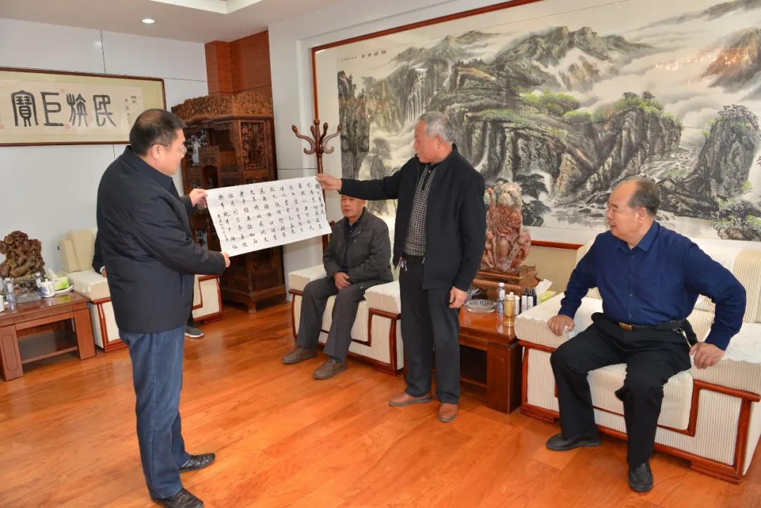 冬日暖陽,瑞氣盈門,2021年11月18日,華風書畫院青州分院院長李豐群一行十人蒞臨盛宏公司看望山東省優秀共產黨員、濰坊市道德模范、盛宏公司董事長劉希山教授,祝賀劉希山教授獲得“國家高級書法師”資質,并受聘為“全國書畫藝術委員會副主席”!大家獻上了“百龍圖”等作品。