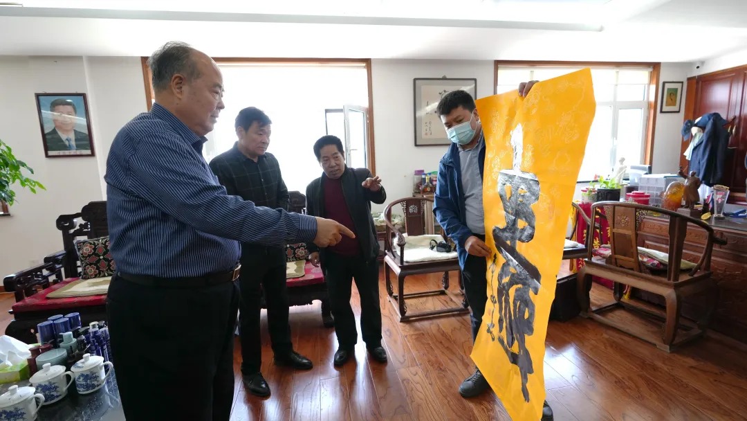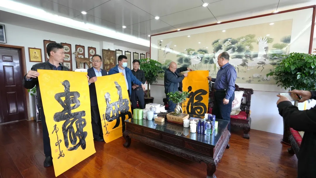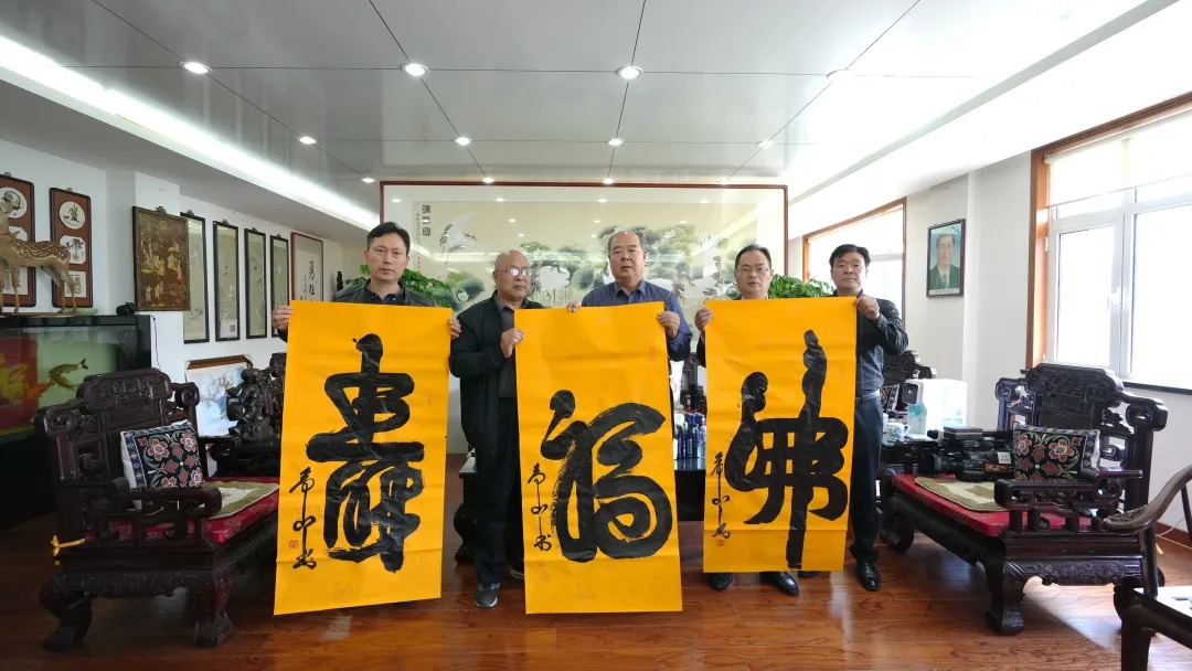 崔新德先生還對劉希山教授的書法造詣表達欽佩之情,對劉希山教授獲得“國家高級書法師”職稱、并受聘為“全國書畫藝術委員會副主席”表示祝賀。四位客人獲得劉希山教授墨寶“一步登天藏龍福”、“一生百年壽”、“觀音送子七星佛”后高興地同劉教授合影留念。