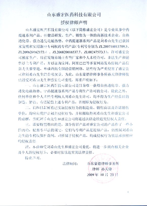 本公司從未授權給任何網站代理山東盛宏醫藥科技有限公司生產的相關產品,現有不法分子在網上銷售我公司產品,已經被工商部門查處為假貨。我公司從不允許網上銷售產品,一切網上銷售的產品均視為假貨,消費者若購買我公司中藥提速系列產品,請就近到公司各地服務中心購買,以確保貨真價實。消費者因購買網上產品造成的一切后果,我公司概不負責。