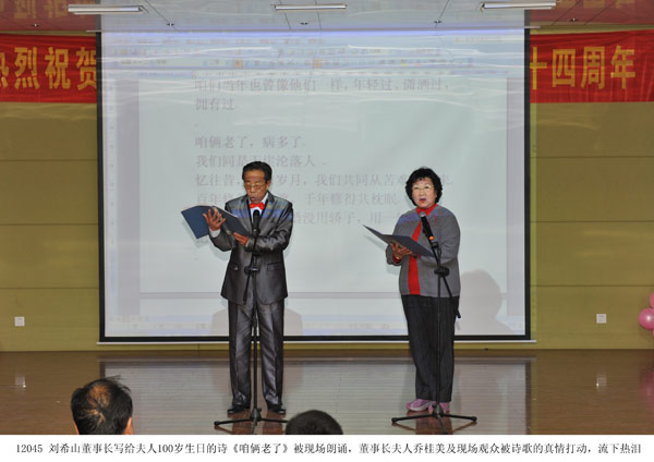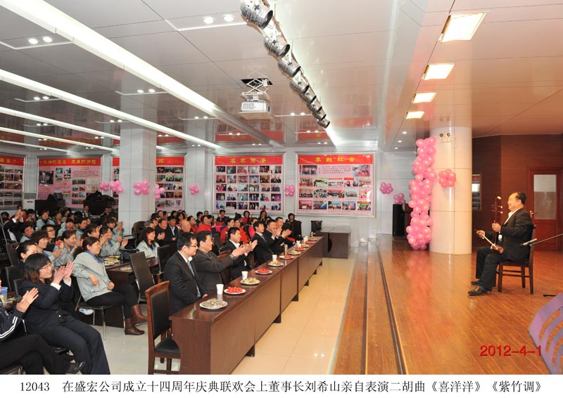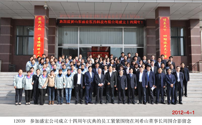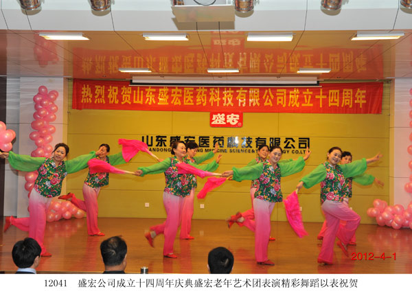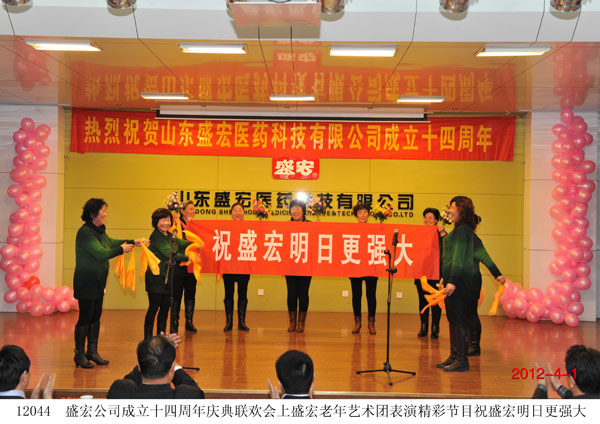 2012年4月1日,山東盛宏醫藥科技有限公司全體同仁在多功能會議室濟濟一堂,大家用飽滿的熱情和精彩的文藝節目共賀公司十四周歲生日。公司董事長劉希山、夫人喬桂美、盛宏房地產公司總經理劉偉濤及前來祝賀的社會各界朋友共同觀看了文藝演出。 劉希山董事長演出前作重要講話,他眼含淚水回顧了十四年來從獨自一人創業到今天萬人參與盛宏中藥提速事業和造福百萬用戶的艱苦歷程。大家聽后深受鼓舞和感動,并倍加珍惜這來之不易的工作機會。一個成功者的背后,必然有一個“賢內助”,劉希山董事長寫給夫人100歲生日的詩《咱倆老了》被現場朗誦,董事長夫人喬桂美以及現場的很多人被詩歌的真情打動,流下熱淚。盛宏老年藝術團的藝術家們同公司員工一起,用自己的歌聲、舞蹈、快板、詩歌等表達著對董事長的崇敬和對公司的熱愛。 趕往北京辦事的王秋萍總經理與奮斗在全國各地的盛宏一線員工,今天未能親臨現場,她(他)們在用勤奮扎實的工作為公司生日獻禮。 |