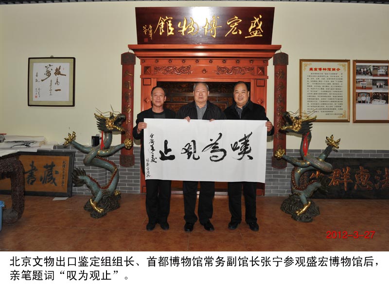 | 2012年3月27日,北京文物出口鑒定組組長、首都博物館常務副館長張寧蒞臨盛宏公司拜訪劉希山董事長,劉希山董事長陪同張寧教授參觀了盛宏博物館、萬期館、榮譽館等“盛宏四館”。張教授對劉希山董事長高雅的收藏愛好和如此豐富的藏品感到驚訝,贊嘆之余,張寧教授欣然提筆寫下了“嘆為觀止”四個大字。 張寧教授是國家級資深陶瓷鑒定專家,中國文物學會文物鑒定委員會副會長、專家委員,CCTV-2《鑒寶》節目專家評委,《藝術品投資》欄目的資深專家,中國收藏家協會常務理事、咨詢鑒定專家委員會委員、副主任、陶瓷收藏委員會顧問。歷任北京文物出口鑒定組組長、北京文物研究所副主任、北京古代建筑博物館館長、北京藝術博物館館長等職。 |