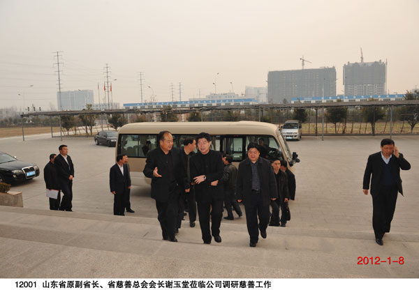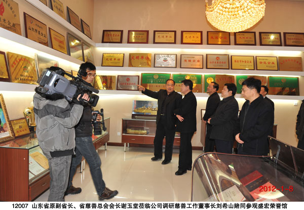 2012 年1月8日 ,山東省原副省長、省慈善總會會長謝玉堂在濰坊市委常委、常務副市長胡崗,濰坊市民政局局長吳海源陪同下到盛宏公司調研慈善工作。劉希山董事長詳細匯報了盛宏的慈善工作,并介紹了盛宏公司在中藥提速治療骨病頑疾領域做出的成績。謝玉堂會長對盛宏公司的慈善事業和中藥提速所取得的成績給予了充分肯定,對劉希山董事長專著《希山格言選·命運》推崇的以忠孝仁義禮智信為核心的道德理念和盛宏文化給予高度評價。