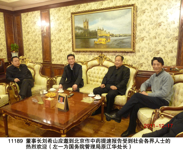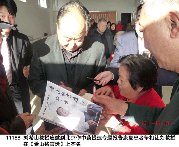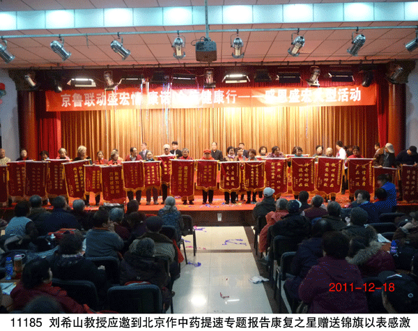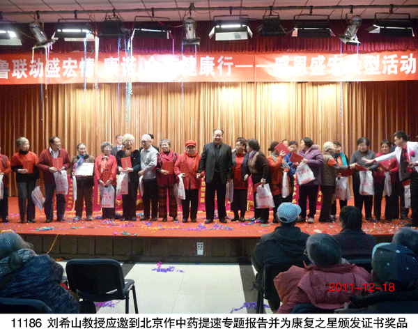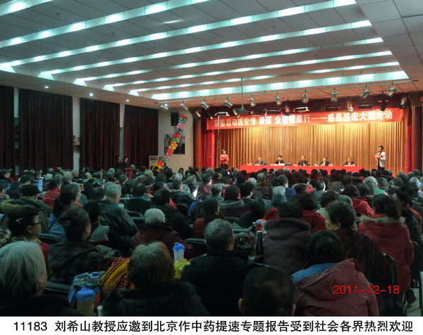 | 2011 年 12 月 18 日 ,劉希山教授應北京社會各界邀請到達首都作學術報告,受到各界友人和首都人民的熱烈歡迎。國務院管理局有關領導熱情接待劉教授并親切交談,領導們贊嘆劉教授發明的中藥提速產品很受首都人民歡迎。300多人濟濟一堂,認真聆聽劉希山教授“中藥提速與人民健康”學術報告,精彩的報告揭示了中醫藥提速治療股骨頭壞死、頸椎病、關節病等骨病頑疾的獨特魅力。劉教授現場為大家做演示,中藥提速最新科研成果——烏發養發液快速的養發效果贏得了全場雷鳴般的掌聲。報告會現場,劉希山董事長還向首都中老年朋友贈送了健康禮品。 |