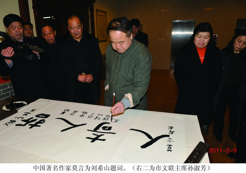 2011年2月9日 ,茅盾文學獎獲得者、中國著名作家莫言先生到盛宏公司拜會劉希山,他高度評價了劉希山的《希山格言選》,并稱贊該書是真正的好書,是普通文人難以寫出來的“奇書”。劉希山稱贊莫言:“你是當代杰出的文學家,是大家!”莫言笑著對劉希山說:“你才是真正的大家,你寫的書里有思想,單純什么家都不能概括你。”接著說,“你是企業家,但你的《希山格言選》運用了辯證法去看待問題,又是哲學家、文學家;你發明了中藥提速產品,療效奇特,是醫學家;治好了那么多人,得到了全國人民送來的萬面錦旗,這些都是奇跡,所以你是奇人;你為社會捐款捐物800多萬元,資助了100多名學生,你是慈善家、是善人。”于是他揮毫潑墨題寫下“哲人奇人劉希山”七個大字。 由于德行的感召,劉希山漸漸為社會知曉和傳頌,人們聞其名、見其人,無不如眾星捧月,社會各界紛紛邀請其蒞臨演講。這位“哲人、奇人、善人”的足跡近年來走遍了大江南北,《希山格言選》哲理的光芒也輝映著所到之處。 2008年11月25日 ,劉希山教授應邀到湖北作報告受到熱烈歡迎,湖北仙桃天誠大酒店容納1000人的會議室整整擠進了2000多人。一位叫劉新滿的肝硬化腹水晚期患者,因使用劉教授中藥提速獲得康復,他將一面寫有“盛宏高科濟世,提速治癌神奇”的錦旗敬獻給了希山先生;一位叫王傳海的慢性腎炎病危患者,使用中藥提速半年“起死回生”,他“撲通”跪在劉希山教授面前磕頭謝救命之恩,劉教授趕緊攙扶,欣慰的淚水涌出眼簾,醫患情深、蕩氣回腸的這一幕感動了所有的人……很快,錦旗堆滿了主席臺,“盛宏,生命的保護神”的頌詞傳遍了整個會場。 2010年6月12日 ,劉希山教授應中共濰坊市委組織部和濰坊市委黨校邀請,為黨校2010年第二期縣級干部進修班講授《感悟人生—命運》,受到黨校領導高度贊揚和進修干部們的一致好評。市委黨校滕錫堯副校長總結說:“劉希山董事長的知識財富也是我們的財富。他從一個企業家的角度形成對我們思想的撞擊,對我們行為的撞擊!” 2011年6月3日 ,濰坊市民政系統干部政治學習活動特別安排在盛宏公司舉行,劉希山董事長應邀為一百多名民政干部演講《命運》,受到干部們熱烈歡迎并引起強烈反響。干部們紛紛贊嘆:“我們聽了一次最好的‘百家講壇’!”濰坊市民政局局長吳海源高度評價劉希山:“立德立功立言,最根本的就是立德。劉老靠著立德,完成了立功立言”、“大家想把工作干好,就趕快讀讀劉老的《希山格言選》吧!” 希 山 先生對社會的貢獻已得到了社會各界的廣泛認可,他因此亦獲得了山東省勞動模范、山東省優秀共產黨員、全國尊老敬老助老模范、山東省十大儒商、濰坊市道德模范、濰坊市杰出文化工作者等榮譽稱號。先后被推舉為山東省政協委員,中國民族醫藥開發委員會副會長,北京中醫藥大學、山東科技大學、濰坊學院等八所大學客座教授。《希山格言選》獲得“社會科學優秀成果一等獎”。由他掌舵的盛宏公司也被科技部認定為“國家重點高新技術企業”。 此為我所見到的哲人、奇人、善人——劉希山。