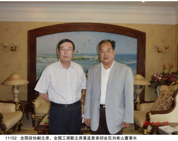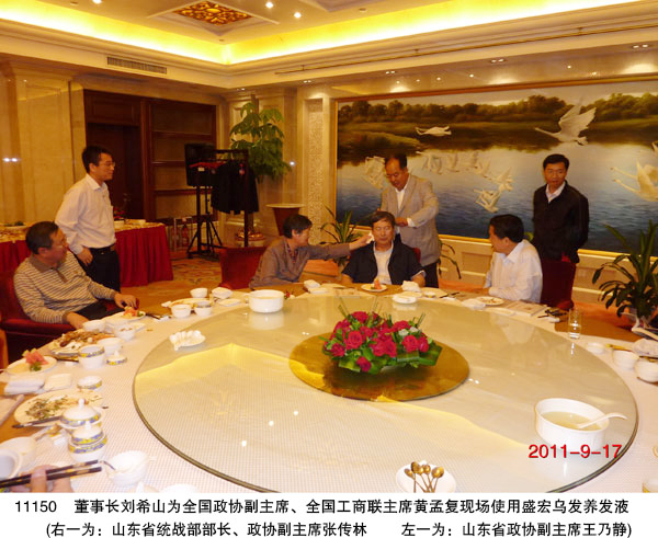 2011年9月17日,全國政協副主席、全國工商聯主席黃孟復在山東省統戰部部長、政協副主席張傳林;山東省政協副主席、山東省工商聯主席王乃靜陪同下,親切接見盛宏公司董事長劉希山教授。劉希山董事長向黃孟復主席匯報介紹了盛宏中藥提速的最新科研成果,黃孟復主席現場使用了盛宏透化帶和烏發養發液,快速活血化瘀的盛宏透化帶和快速變發的純中藥烏發養發液得到了領導的肯定和贊譽,黃孟復主席鼓勵劉希山教授要研發更多更好的中醫藥產品造福人類。