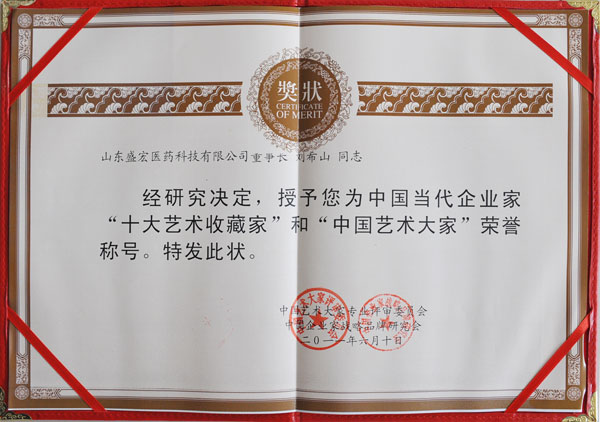 2011年6月10日,中國藝術大家專業評審委員會、中國企業家戰略品牌研究會聯合授予劉希山董事長中國當代企業家“十大藝術收藏家”和“中國藝術大家”雙重榮譽稱號。 劉希山董事長不僅是一名企業家,而且博古通今,酷愛收藏藝術。他親手創建了盛宏博物館,成為山東省內最大的皇家御用品博物館。該館因藏品上雕龍二千多條,故又稱“千龍博物館”。其中有龍袍、龍床、龍榻、龍屏風等罕見珍貴藏品,有惟妙惟肖的紅銅十二生肖,有歷史名人匾額、御用香爐、古青銅器、玉石制品、古代陶瓷、象牙雕刻、名人字畫等各大類,觀者無不為之震撼。其中一件重21斤4兩的巨型“征西大將軍”田黃石印,通過北京專家鑒定,為目前最重的田黃石極品。劉希山董事長的藏品一是自己多年的收藏積累,二是很多康復患者聽說劉教授酷愛收藏時送來的珍藏之物。所以,盛宏博物館是盛宏人送健康送出來的,是廣大康復用戶謝恩盛宏謝出來的,是人世間“大愛有緣”愛出來的。盛宏博物館被譽為“醫患和諧博物館”。