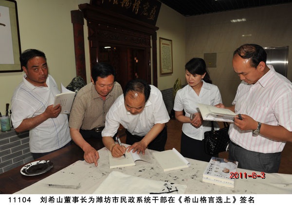 2011年6月3日,濰坊市民政系統干部政治學習活動特別安排在盛宏公司舉行,劉希山董事長應邀為一百多名民政干部演講了《希山格言選·命運》,受到干部們熱烈歡迎并引起強烈反響。 “人人都想三個好事:升官,發財,長壽。怎樣達到?”“按照《希山格言選》做,做到好的道德、好的文化、好的身體‘三件寶’,就能達到這三個目標!”劉希山董事長首先贊嘆了我市民政干部們為老百姓和兒童福利事業做出的突出貢獻,然后圍繞如何做好人民的公仆,以《希山格言選·命運》為教材,著重演講了“好的道德,好的文化,好的身體”三件寶和“忠孝仁義禮智信”,并提出了只有做到“三忠于——忠于國家,忠于人民,忠于職守”,才是真正受人民歡迎的公務員和領導干部。 董事長的演講贏得了全體民政干部們一陣陣熱烈的掌聲。濰坊市民政局局長吳海源高度評價了盛宏公司和劉希山董事長:“‘立德立功立言’,最根本的就是‘立德’,劉老靠著‘立德’完成了‘立功立言’。我來過盛宏十次,這次就是要帶大家一塊來學習”、“盛宏靠辦實事樹立了群眾的信心,盛宏公司好不好?萬旗為證!”“大家想把工作干好,就趕快讀讀劉老的《希山格言選》吧!”大家紛紛贊嘆:“我們親臨盛宏現場,聽了一次最好的‘百家講壇’!”