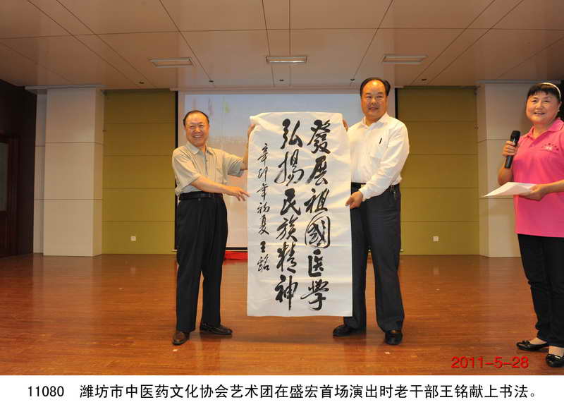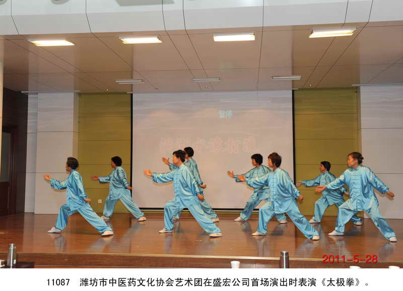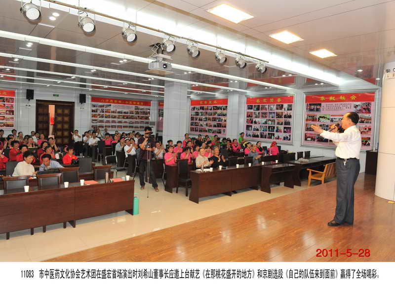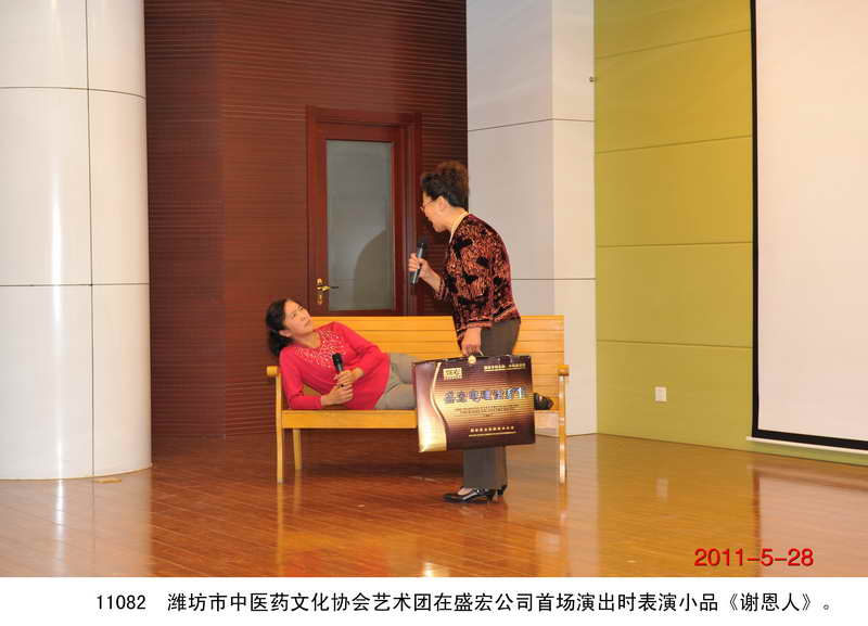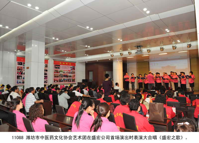 2011年5月28日下午,悠揚的歌聲、激情的舞曲、快樂的小品聲不時從盛宏公司多功能會議廳傳出,濰坊市中醫藥文化協會藝術團在這里舉行了成立后的首場演出,劉希山董事長、王秋萍總經理、濰坊市中醫藥文化協會部分領導以及盛宏全體員工共同觀看了這道文化大餐。 一個個節目紛彩畢呈,詩朗誦《感悟盛宏》、舞蹈《天竺少女》、太極功夫扇、情景劇《親家母》、小品《謝恩人》、京劇《龍鳳呈祥》等等,藝術家們的精彩表演將美、愛、情、景交融為一體,表達了人們對健康生活的向往,展示了盛宏公司在劉希山董事長和王秋萍總經理的帶領下勇于創新中藥、造福頑疾患者的杰出貢獻。多才多藝的劉希山董事長應藝術家們的邀請上臺獻藝,他的一曲《在那桃花盛開的地方》以高亢嘹亮的男高音征服了演藝界專業人士和所有觀眾,贏得了全場經久不息的掌聲。節目最后,董事長應大家邀請再次登臺獻上了京劇選段,他中氣充沛、字正腔圓,將一段《自己的隊伍來到面前》唱得沁人心脾、回味無窮,受到專業京劇演員們高度評價并折服了全場觀眾。 據悉,濰坊市中醫藥文化協會是由盛宏公司發起和贊助,旨在弘揚中醫藥文化、造福人民的非營利性社會團體。