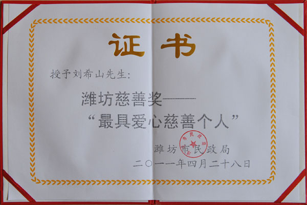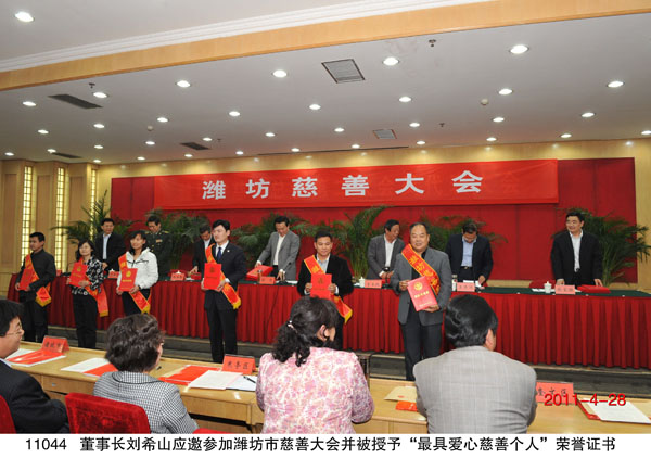 | 。 2011 年4月28日 ,“濰坊市慈善大會”暨“濰坊市慈善總會第二屆理事會”在市政府大樓隆重舉行。市委常委、常務副市長胡崗同志作重要講話。大會授予盛宏公司董事長劉希山、臺商劉竹承等企業家“最具愛心慈善個人”稱號,劉希山董事長還當選為市慈善總會榮譽副會長。 胡崗副市長高度評價了劉希山等慈善家的愛心善舉。劉希山同志以一顆金子般的心和堅忍不拔的毅力在中藥提速領域高屋建瓴,走出了一條經皮給藥、速克骨病頑疾的新路子,為百萬患者送去了健康,曾多次義捐達880多萬元,當選為中國民族醫藥開發委員會副會長、“省優秀共產黨員”、“省勞動模范”,被授予“山東省十大儒商”、“山東省抗震救災先進個人”、“齊魯巾幗創業導師”、“濰坊市道德模范”、“濰坊市杰出文化工作者”等稱號,并被山東經濟學院、濰坊學院等八所大學聘為“兼職教授”,他親筆撰寫的《希山格言選》就是他大愛精神的濃縮和精華。
