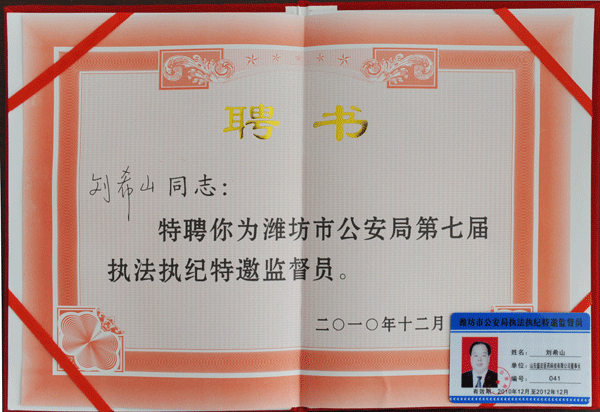2010年12月6日,劉希山董事長受聘為“濰坊市公安局第七屆執法執紀特邀監督員”并接受了聘書。