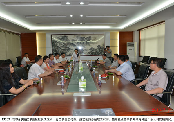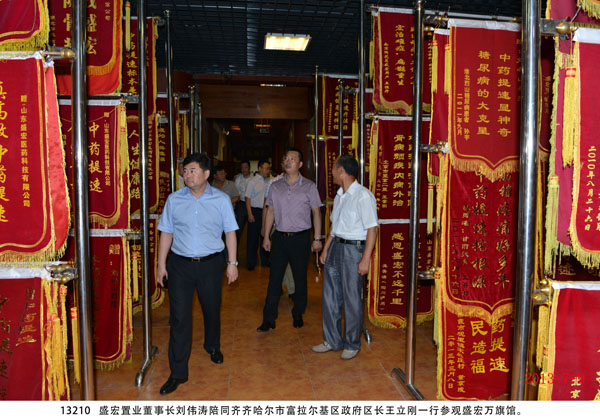 2013年7月9日,黑龍江省齊齊哈爾市富拉爾基區政府區長王立剛一行蒞臨盛宏集團公司參觀考察,盛宏醫藥公司總經理王秋萍、盛宏置業公司董事長劉偉濤分別向客人們介紹了醫藥公司、置業公司、酒店管理公司、中醫院、小額貸款公司等旗下公司的經營情況,并陪同客人們參觀了“盛宏四館”。 王立剛區長對盛宏在治療股骨頭壞死、腰椎間盤突出、頸椎病、腹部腫瘤等頑疾領域取得的成績表示贊嘆,對盛宏中醫院獨特的中醫中藥療法和“治未病”為主題的做法給予充分肯定,并對“盛宏四館”和劉希山董事長親筆撰寫的《希山格言選》給予高度評價。