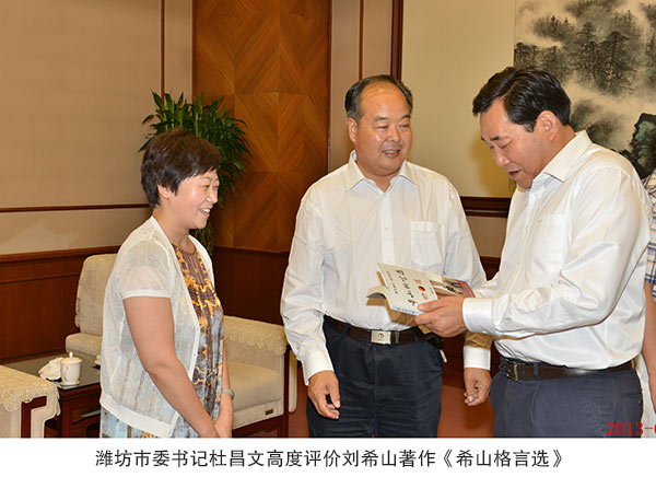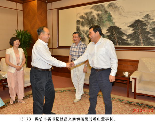 2013年6月13日,濰坊市委書記杜昌文親切接見盛宏公司董事長、盛宏中醫院院長劉希山和總經理王秋萍。劉希山董事長向杜昌文書記詳細匯報了盛宏公司和盛宏中醫院的發展情況。杜昌文書記對盛宏在中藥提速治療股骨頭壞死等頑疾方面作出的成績給予充分肯定,對《希山格言選》和盛宏文化高度評價。