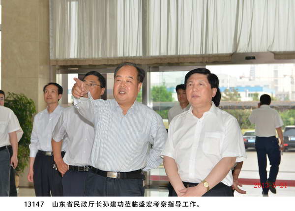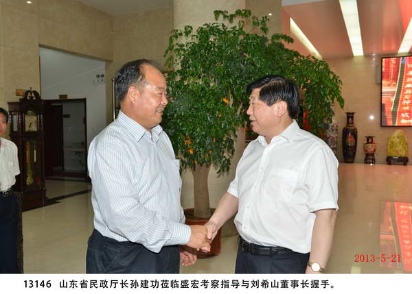 2013年5月21日,山東省民政廳廳長孫建功在濰坊市民政局局長吳海源的陪同下蒞臨盛宏調研。盛宏公司董事長劉希山向孫建功廳長詳細匯報了盛宏公司的各項慈善事業,以及盛宏中醫院治療股骨頭壞死、腰椎間盤突出、頸椎病等頑疾領域取得的成績。孫建功廳長劉希山董事長設立千萬“盛宏慈善基金”等慈善事業給予充分肯定和稱贊,對盛宏造福人民的事業以及盛宏中醫院的高尚醫德給予高度評價。