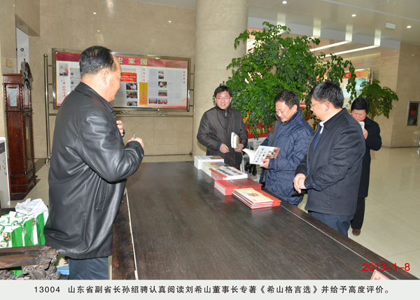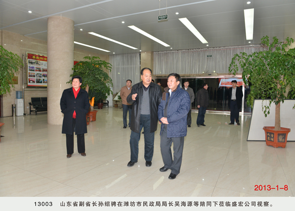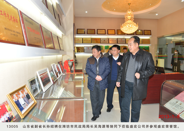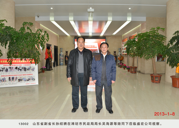 | 孫紹騁副省長到盛宏公司視察 2013年1月8日,山東省副省長孫紹騁在濰坊市民政局局長吳海源陪同下到山東盛宏醫藥科技有限公司視察。孫紹騁副省長仔細聽取了劉希山董事長關于盛宏公司和盛宏中醫院的工作匯報,并在劉希山董事長陪同下參觀了盛宏博物館、萬旗館和榮譽館。 孫紹騁副省長對盛宏公司和盛宏中醫院在治療股骨頭壞死、脈管炎、壞疽等頑疾領域取得的成績給予充分肯定,并高度評價了劉希山教授專著《希山格言選》的哲學和思想價值。 |