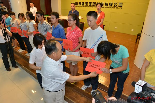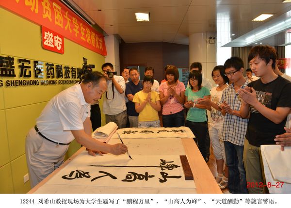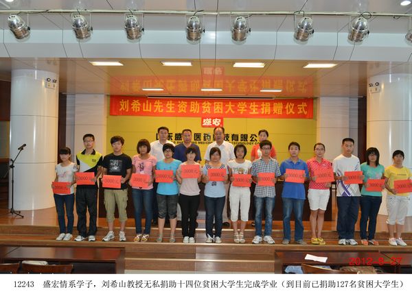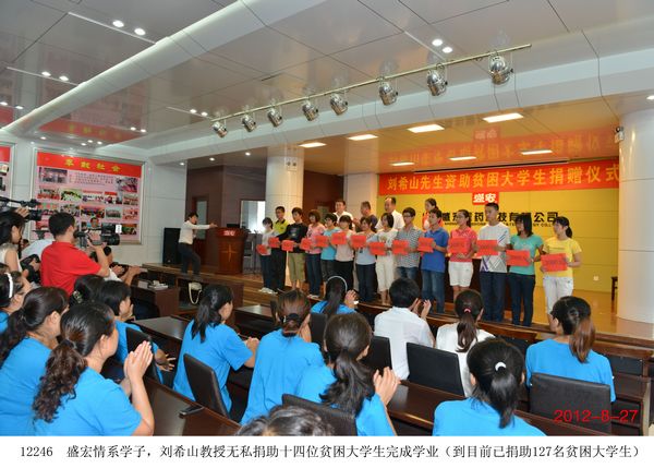 劉希山 教授再次資助 14 名大學生完成學業 2012年8月27日,山東省優秀共產黨員、中國民族醫藥開發委員會副會長、中藥提速專利發明人劉希山先生捐資助學儀式在盛宏公司多功能會議室舉行。盛宏公司董事長劉希山,濰坊市慈善總會辦公室主任楊宏偉、王曉真以及接受資助的14名大學生出席儀式。 楊宏偉主任高度評價了劉希山教授的大愛胸懷,對劉希山教授近年來捐款捐物980多萬元、連續捐助127名大學生完成學業的義舉給予贊嘆,并號召企業家及社會各界人士共同加入到扶危濟困的隊伍中來。青島大學王浩鑫同學懷著激動的心情代表受資助的學生發言,對劉希山爺爺無私的關愛表示感謝,并決心在今后的人生道路上德才并進,成為國家棟梁。 捐贈儀式后,劉希山教授還為這些大學生題寫了“鵬程萬里”、“山高人為峰”、“天道酬勤”等箴言警語,并送給他們自己親筆撰寫的成功學專著《希山格言選》,勉勵他們要樹立遠大抱負,不辜負國家對他們的培養。 |