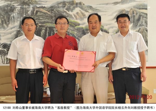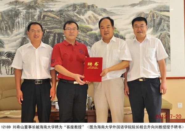 2012年6月26日,劉希山董事長被海南大學國際文化交流學院聘為“客座教授”,至此劉希山董事長已經被九所大學聘為“客座教授”。 7月20日,海南大學外國語學院院長楊云升蒞臨盛宏公司拜訪劉希山教授,并代表學院邀請劉希山董事長抽出時間到海南大學講學,劉希山教授高興地接受了邀請。楊院長高度評價劉希山董事長的專著《希山格言選》,他稱贊該書凝聚了濃郁的中華文化和健康積極的價值觀。他征得劉教授同意后正著手翻譯成英文在海外出版發行。