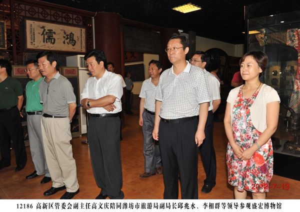 2012年7月13日,濰坊市旅游局副局長邱兆水、李相群帶領各縣市區旅游系統干部一行二十多人,在高新區管委會副主任高文慶陪同下蒞臨盛宏公司調研,王秋萍總經理向各位領導介紹了盛宏新產品創傷凈、痱凈等純中藥防護用品在旅游業發揮的重要作用,以及公司在旅游文化方面作出的各項成績。 王秋萍總經理還陪同各位領導參觀了備受社會各界關注的盛宏博物館、萬旗館、老子館等“盛宏六館”,并將劉希山董事長專著《希山格言選》贈送給各位領導。邱兆水副局長高度評價了“盛宏六館一書”的文化含金量和旅游觀光價值,對盛宏公司創建的高度的醫患和諧關系給予贊嘆。
