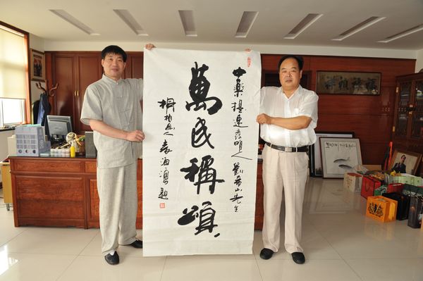 2012年6月23日,山東省公安廳交警總隊總隊長徐世杰在濰坊市公安局交通警察支隊支隊長陳強陪同下蒞臨盛宏公司參觀指導,世界教科文衛專家、中國書法家協會會員袁海涌等各界友人同日蒞臨盛宏參觀,劉希山董事長陪同各位領導和各界朋友參觀了盛宏萬旗館、博物館、老子館等“盛宏六館一書”。 徐世杰總隊長高度評價了盛宏公司在中藥提速事業作出的不凡成績,感謝盛宏公司關愛交警、曾經為濰坊市交警支隊一線交警捐獻盛宏透化帶等醫護產品。袁海涌大師參觀后對劉希山董事長的奉獻精神和濃郁的盛宏文化感動,他揮毫潑墨題贈劉希山董事長:“哲人、奇人、善人、高人也”!并為盛宏萬旗館題寫館名:“天下第一錦旗館——萬旗館”。