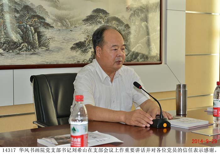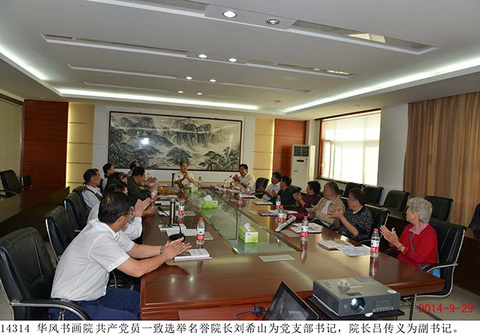 2014年9月29日,華風書畫院全體共產黨員在盛宏公司會議室召開支部會議,全體黨員一致選舉山東省優秀共產黨員、華風書畫院名譽院長劉希山為華風書畫院黨支部書記,呂傳義院長為副書記。 劉希山書記作重要講話,他對各位黨員的信任表示真誠感謝。呂傳義副書記對劉希山書記百忙之中大力支持華風書畫院工作表達了誠摯的謝意。 一位老黨員代表全體黨員談了自己的感受:“今天我有三個想不到:一是想不到在濰坊市內有這么好的一個公司;二是想不到我這么多年沒過組織生活了,今天能在盛宏過一次充實的組織生活;三是想不到華風書畫院能得到劉希山教授這位‘哲人奇人’作為我們的書記!而且他是那么平易近人……”全場響起共鳴的掌聲。 |