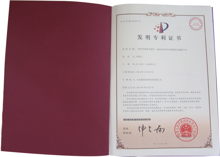 近日,盛宏公司純中藥制劑脈潰凈榮獲國家發明專利并取得了證書。國家知識產權局于2014年6月25日授權公告。脈潰凈主要用于治療脈管炎、靜脈炎、靜脈曲張、潰瘍壞疽等皮膚頑疾,臨床驗證效果明顯優于傳統療法。 這一發明專利傾注了發明人劉希山教授的心血,也再次展示了盛宏透皮技術的優勢。至此,盛宏公司專利已達37項,其中僅發明專利就有13項。 附:脈潰凈治療靜脈炎四天效果對比