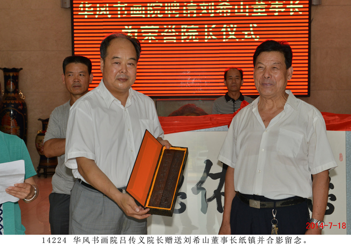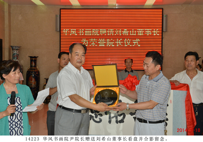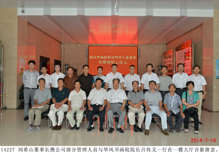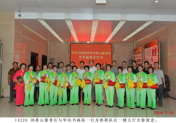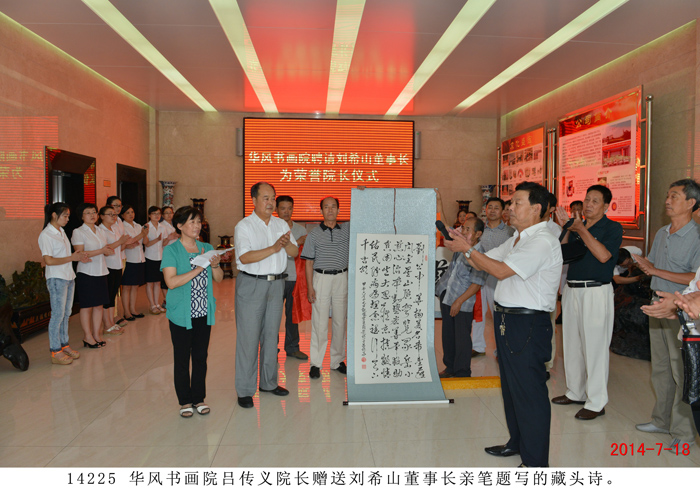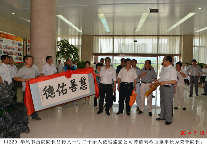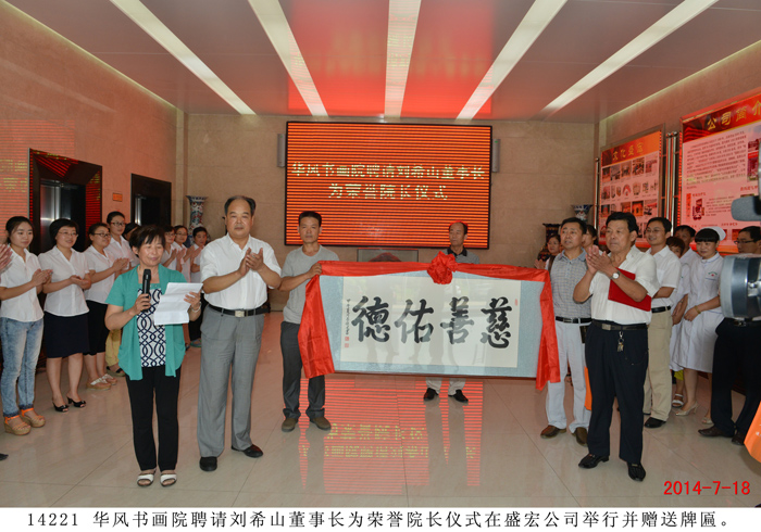 | 華風書畫院聘請劉希山、莫言為名譽院長 儀式在盛宏公司舉行 “劉希山董事長是道德模范,他是一位了不起的人物,是大家學習的楷模,所以我們聘請他為名譽院長!” 2014 年7月18日,華風書畫院院長呂傳義一行二十余人蒞臨盛宏公司,誠聘劉希山董事長為華風書畫院名譽院長,另一位名譽院長為莫言先生。劉希山董事長、王秋萍總經理率管理人員歡迎。 聘請儀式在盛宏公司辦公樓一樓大廳舉行,大廳內鑼鼓喧天,秧歌隊翩翩起舞,氣氛隆重祥和。呂傳義院長代表華風書畫院全體會員向劉希山董事長遞交聘書,劉希山董事長愉快地接受聘請。莫言先生的聘書也由莫言好友劉希山教授代轉。呂傳義院長以欽佩仰慕之情朗誦了自己親筆題寫的藏頭詩,全場感動,大家報以熱烈的掌聲。 詩曰:“劉公中華揚美名,希望工程閃金星。 山頂會覽眾岳小,慈心治本數盛宏。 善舉救助貧困生,大恩難忘扶掖情。 佑民除病為理念,德行天下千古頌。” ——將八句詩的頭一個字連起來,就構成了“劉希山慈善大佑德”! 書畫院尹院長、呂院長分別向劉希山教授贈送了看盤與紙鎮。隨后,書畫家們共同托起一塊由呂傳義院長親筆題寫的“慈善佑德”功德匾獻給劉希山董事長。“慈善佑德”,是藝術家們親眼目睹了劉希山董事長十七年來治愈千千萬萬股骨頭壞死、腰椎間盤突出等頑疾患者、向社會捐款捐物990萬元、以及設立千萬元“盛宏慈善基金”等事跡后,發自內心的評價。 劉希山董事長對華風書畫院呂傳義院長等書畫家們真摯的厚愛表示感謝,并將自己親筆撰寫的100本《希山格言選》,以及創傷凈、腳氣凈等盛宏產品回贈客人,受到書畫院藝術家們熱烈歡迎。 |