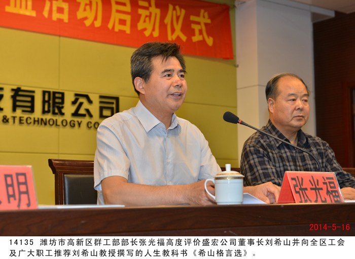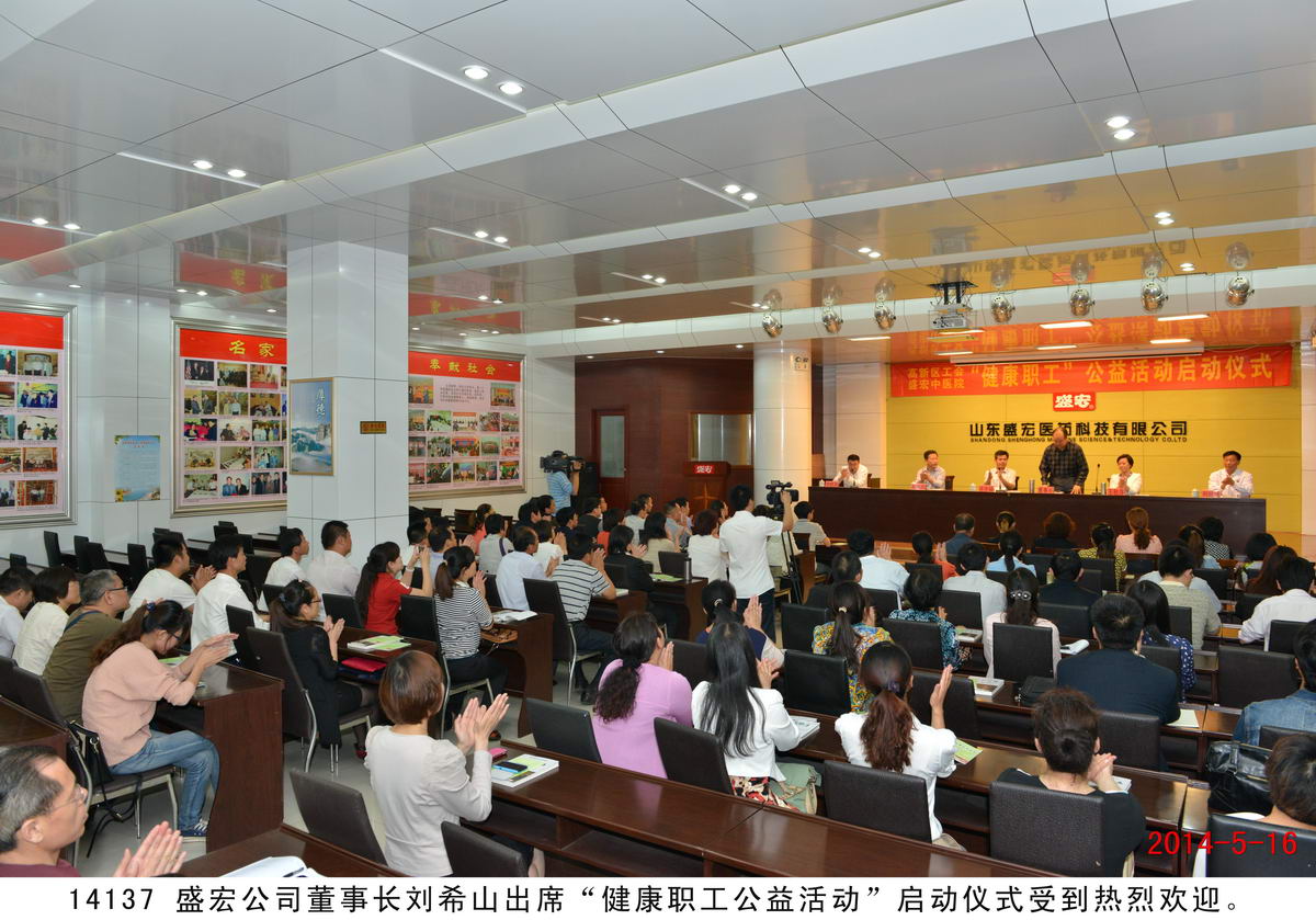 2014 年5月16日 ,由 濰坊市高新區工會與盛宏中醫院聯合舉辦的“健康職工公益活動”在盛宏公司會議室舉行啟動儀式,高新區群工部部長張光福、高新區總工會副主席初永明、盛宏公司董事長劉希山、總經理王秋萍等出席儀式 ,近百家企事業單位的工會主席或代表參加會議。以中國民族醫藥開發委員會副會長劉希山教授為院長的盛宏中醫院為這些單位提供了3000多張《職工免費就診卡》,免費為患有股骨頭壞死、腰椎間盤突出、頸椎病等頑疾的職工進行診治。 “劉希山董事長是一位真正在踐行社會主義核心價值觀的優秀企業家!”張光福部長作重要講話,他高度評價盛宏公司董事長劉希山懸壺濟世的精神,并向全區工會及廣大職工推薦劉希山教授撰寫的人生教科書《希山格言選》:“莫言看了這本書后親筆為作者劉希山題詞‘哲人奇人’,人們難得見到莫言對人作出如此高的評價。希望大家回去認真閱讀,自知其妙!”張光福部長還向大家介紹了自己閱讀《希山格言選》的真切體會,他說自己讀后深為嘆服,忍不住提筆寫了一篇3000多字的讀后感——《遙遠的緣分》,接著隨口讀了幾段,全場響起陣陣熱烈的掌聲。各企事業單位工會代表獲贈《希山格言選》后如獲至寶,大家紛紛表示要將這當代正能量的奇書、職工教育的好教材帶回企業,組織職工一起認真研讀。 |