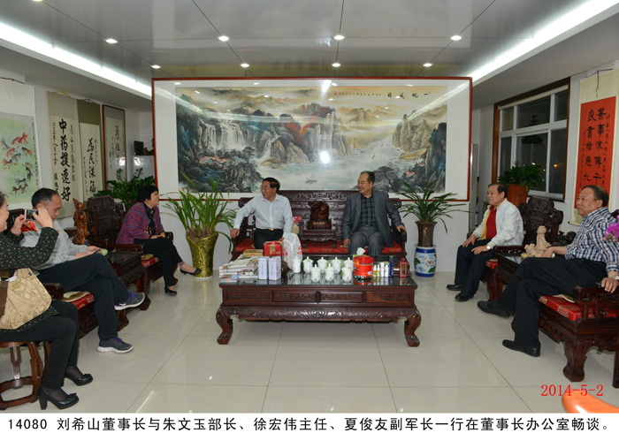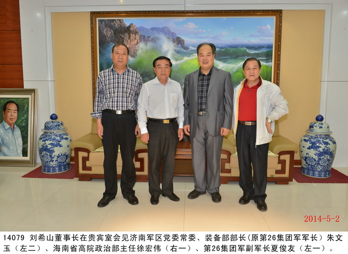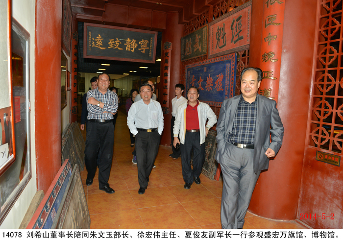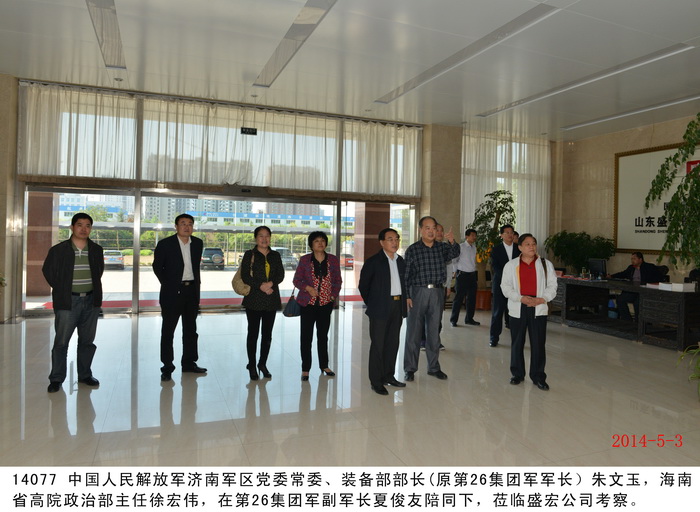 2014 年5月2日 ,中國人民解放軍濟南軍區黨委常委、裝備部部長朱文玉將軍,海南省高院政治部主任徐宏偉,在陸軍第26集團軍副軍長夏俊友陪同下,蒞臨盛宏公司考察。公司董事長劉希山陪同朱文玉將軍一行參觀盛宏萬旗館、博物館等盛宏四館。朱文玉將軍對盛宏公司中藥提速產品在治療股骨頭壞死、腰椎間盤突出等骨病頑疾方面做出的突出成績給予充分肯定。徐宏偉主任也高度評價以劉希山董事長著作《希山格言選》為核心的盛宏文化,并贊嘆盛宏公司在醫患和諧、道德講堂、慈善事業等方面為民營企業做出了表率。 |