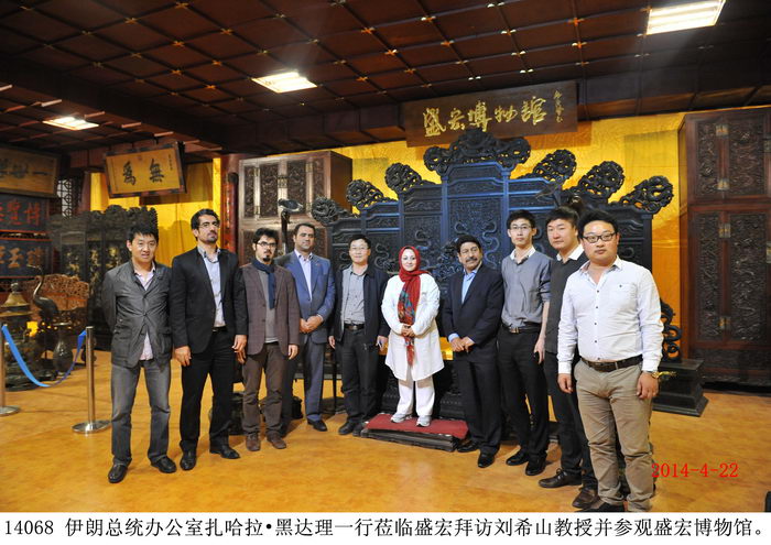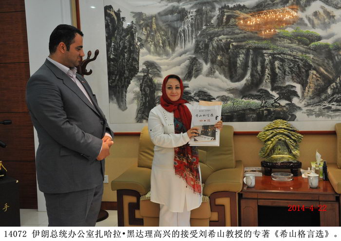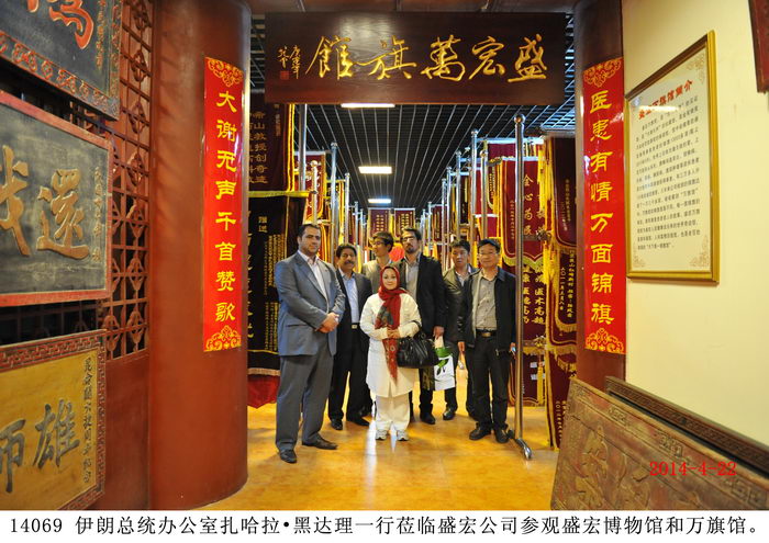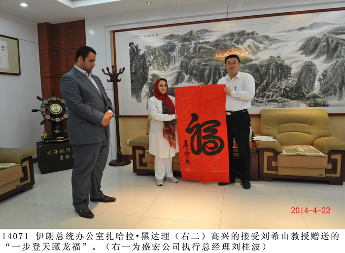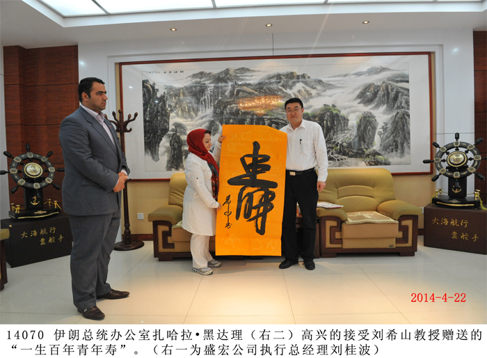 2014年4月22日,伊朗總統辦公室科學學會成員、伊朗草藥大學主席扎哈拉?黑達理等一行數人蒞臨盛宏公司參觀考察,并拜訪劉希山董事長。在盛宏公司執行總經理劉桂波陪同下,伊朗客人參觀了盛宏博物館、萬旗館。 伊朗客人對盛宏電磁治療儀治愈了千千萬萬例股骨頭壞死、腰椎間盤突出等頑疾患者感到驚奇和嘆服,對擁有13000多面錦旗的“天下第一錦旗館”盛宏萬旗館、收藏有300多塊明清古匾與明清龍床的盛宏博物館感到震撼。 劉希山教授將自己的專著《希山格言選》和親筆書寫的“一生百年青年壽”、“一步登天藏龍福”贈送伊朗客人,扎哈拉?黑達理主席說她非常喜歡劉希山教授的文化名著《希山格言選》和劉教授的“太極體”榜書書法,并高興地持書合影。 |