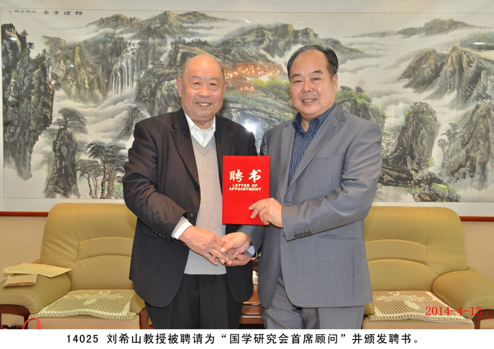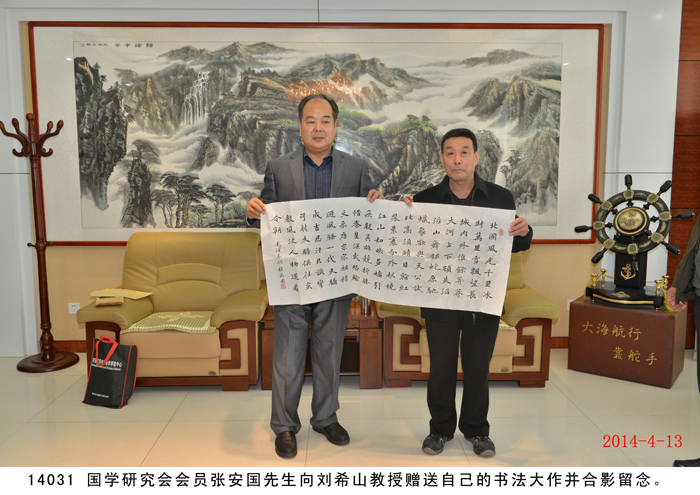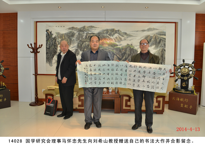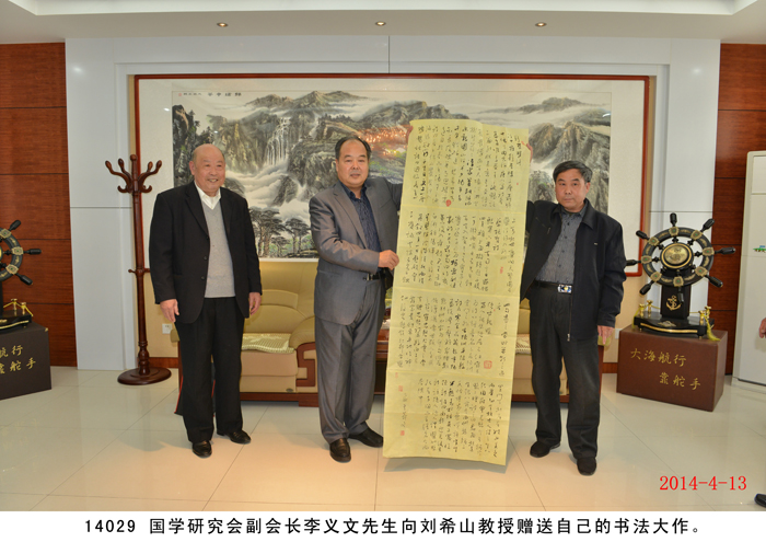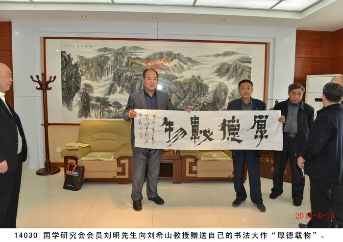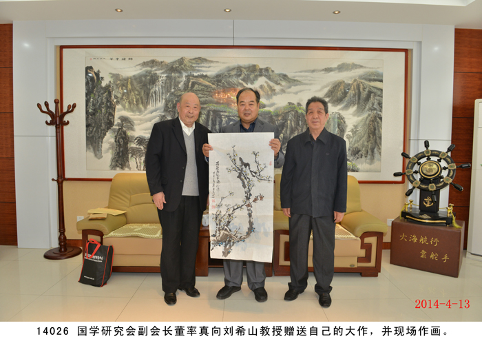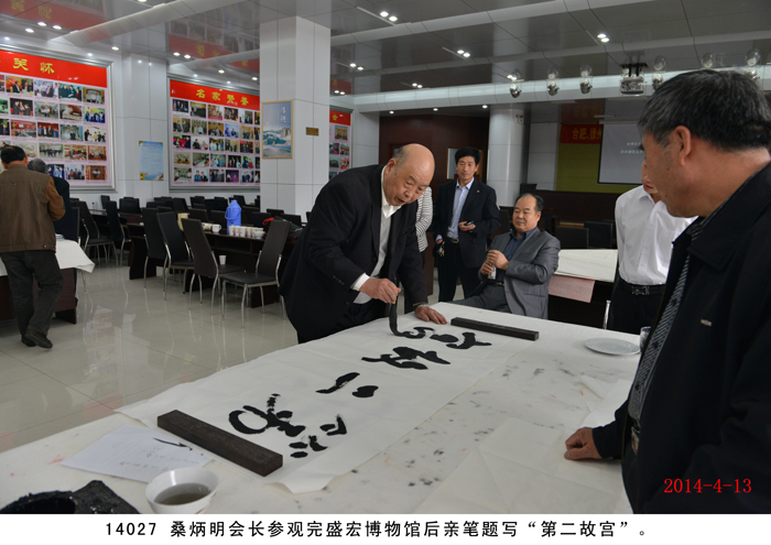 2014年4月13日,國學研究會一行九人在桑炳明老會長帶領下蒞臨盛宏拜訪劉希山董事長,受到劉希山董事長的熱烈歡迎和熱情接待。桑炳明會長說自己是慕名已久而終來,他高度評價劉希山教授為人類健康作出的突出貢獻,贊嘆《希山格言選》展示的思想境界,盛贊劉希山教授“是一位了不起的思想家”。他將自己親筆撰書的“儒商典范華佗藝;滄海襟懷菩薩心”對聯贈劉希山董事長。劉希山董事長也贊揚桑炳明老先生是一位德高望重的文學家和國學大家,并將自己的專著《希山格言選》、一次治愈腳氣和灰指甲的純中藥產品“腳氣凈”、“創傷凈”等贈送各位客人。 研究會的各位畫家、書法家、文學家們分別向劉希山教授贈送了自己的大作,并現場書字作畫。期間,桑炳明會長一行還參觀了盛宏博物館,大家唯一感受到的就是奇特藏品和文化的震撼,桑老脫口而出:“真是第二故宮!”并親筆題寫“第二故宮”四個大字。