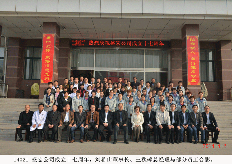 2014年4月2日,是山東盛宏醫藥科技有限公司成立十七周年的大喜日子。十七年來,公司先后開發出盛宏電磁治療儀、自熱透化帶、育發寶液等二十多個系列產品,獲得專利36項,大獎200余項。電磁治療儀為千千萬萬股骨頭壞死、腰椎間盤突出等頑疾患者祛除了病痛,27省139批共計4萬多名康復患者赴盛宏謝恩。企業榮獲“高新技術企業”、“山東省消費者滿意單位”、“省級守合同重信用企業”、“專利明星企業”等稱號。“盛宏”商標被評為“山東省著名商標”。 公司熱心社會公益,先后捐款捐物990余萬元,資助127名大學生完成學業,去年又拿出1000萬元設立“盛宏慈善基金”。 早上8:00,公司總部部分員工高興地圍繞在劉希山董事長周圍,慶祝公司生日并合影留念。而此時此刻,盛宏公司大部分員工仍然奮戰在市場和生產的第一線,他們為了公司的發展、為了人民的健康、為了中醫藥事業的改革創新揮灑著汗水,奉獻著自己的青春年華!在此,我們通過網絡將劉希山董事長和王秋萍總經理的親切問候送給全國各地1200多家服務中心的主任和工作人員,送給所有的盛宏市場人員和管理生產人員,送給長期以來關心和支持盛宏發展的社會各界朋友,祝你們身體健康,萬事如意!祝盛宏公司蒸蒸日上,再創輝煌!