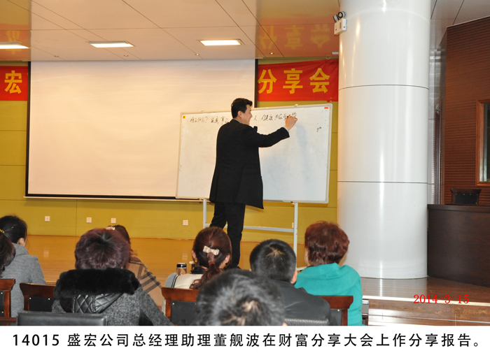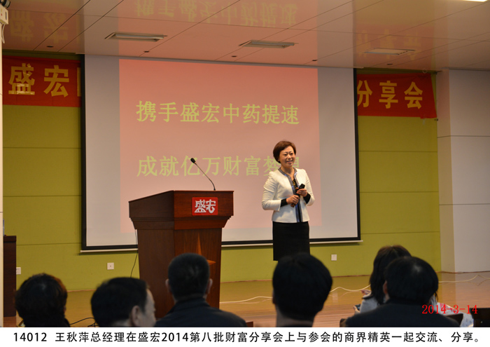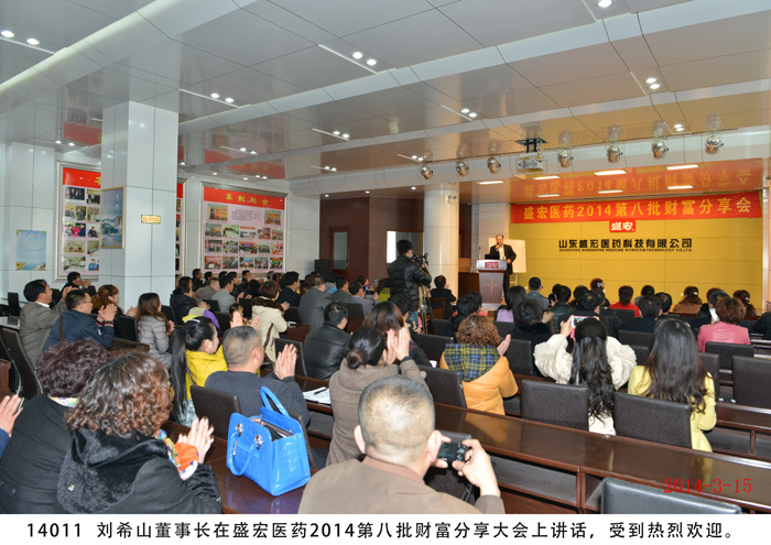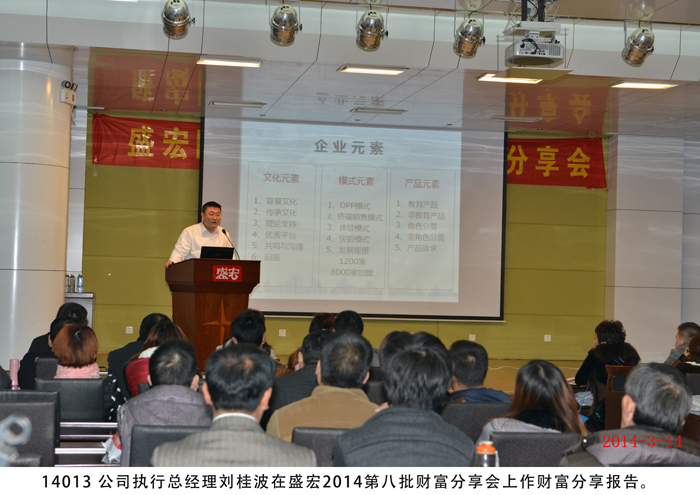 盛宏2014第八批財富分享會在公司總部舉辦 “攜手盛宏中藥提速,成就億萬財富夢想”。3月13-15日,盛宏公司2014第八批財富分享會在公司總部多功能會議室舉行,來自甘肅、山東、貴州、遼寧、重慶、湖南、陜西、山西、河南等地的100多名商界精英歡聚盛宏,接受了公司醫藥專家和營銷專家的培訓。 短短的兩天培訓,大家迅速掌握了相關產品知識、中醫藥知識、以及當前國內先進的營銷理念和營銷方法,他們深感獲益匪淺。特別是參觀完盛宏四館和見到劉希山董事長之后,他們對盛宏公司的文化、誠信和劉希山董事長的大愛精神感動不已,對回去后運作好盛宏產品更加充滿信心。大家一致認為:好的產品、好的運營模式加上一個有道德的公司的大力支持,事業必定成功! |