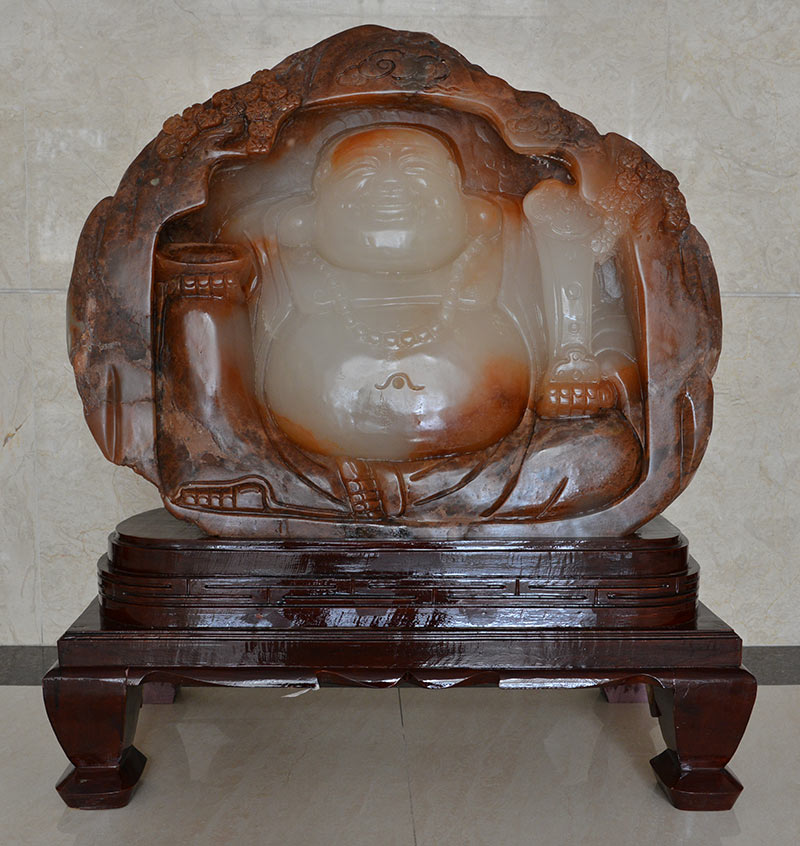 | 新疆康復患者到盛宏公司謝恩,一位康復后的老者向劉希山董事長提供了一個大型玉彌勒像信息,劉希山董事長聞訊立即將這尊罕見的玉像請了回來。這是一尊用整塊天然巨型玉石雕成的玉彌勒佛,像高 0.8m ,寬 0.96m ,重達390公斤,于辦公樓大廳內供放,為公司增添了吉祥。該彌勒像由雕刻師巧妙地將瑩潤無瑕、質白純凈的像身,雕刻到了棗紅色的玉佛龕內,渾然一體,天設地造。“鴻運當頭”的紅色額頭更是被人贊嘆奇特。 |