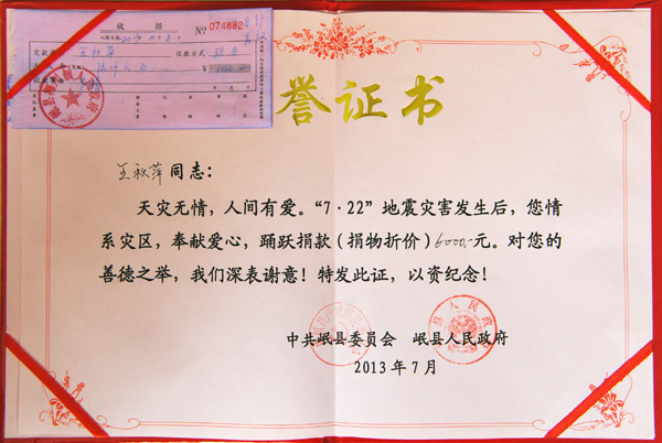 2013年7月22日,甘肅省定西市岷縣、漳縣交界發生6.6級地震,盛宏公司總經理王秋萍聞訊當場拿出自己包中僅有的6000元捐獻災區,并捐獻了發往災區的物流費用。 王秋萍總經理曾先后向北川、玉樹等地震災區捐款捐物,并親赴北川慰問災區人民,被授予“情系北川·愛心大使”、“情系玉樹·愛心大使”等稱號。