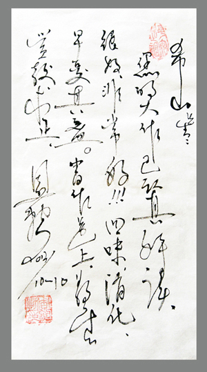 2013年10月15日下午,被莫言譽為“哲人奇人”的盛宏公司董事長劉希山教授收到一封陌生而又親切的信,里面盛著大氣磅礴的幾幅書法作品,和一封用毛筆寫成的親筆信,行草書法嫻熟豪放:“希山先生:您的大作已認真拜讀,很好,非常好!!!回味消化,早受真益……”落款“周烈勛”。