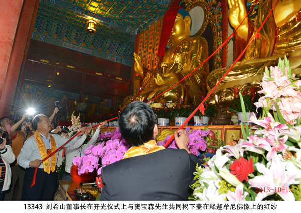 山東盛宏醫藥科技有限公司董事長、功德主劉希山先生應邀出席開光大典,并在開光儀式上與萬佛寺大功德主竇寶榮的胞弟竇寶森先生共同揭下蓋在釋迦牟尼佛像上的紅紗。佛光普照,心光盛發,開光大典圓滿成功。